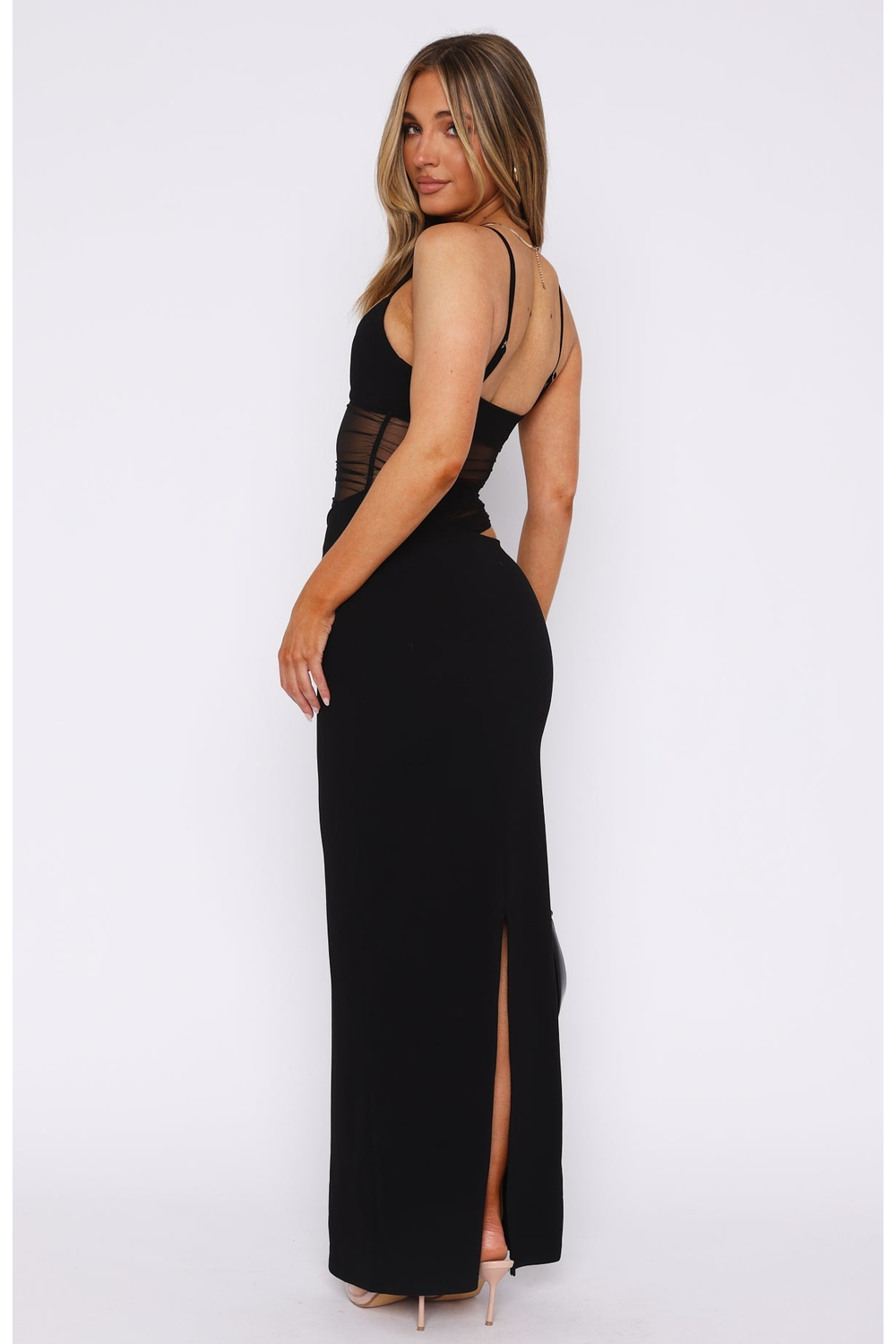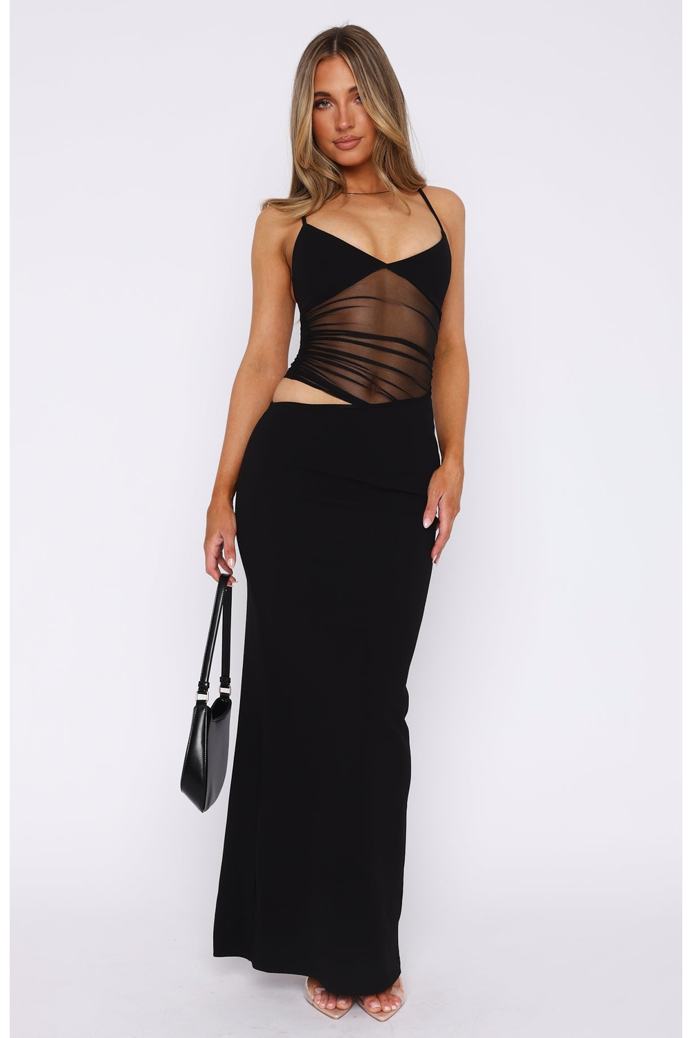 Make an entrance in the Adrasteia Maxi Dress, featuring a sheer mesh bodice, lined bust cups, side cutouts, and adjustable straps for the perfect fit. Its sleek maxi length and striking details bring bold elegance to any night out.