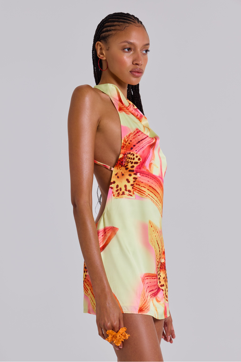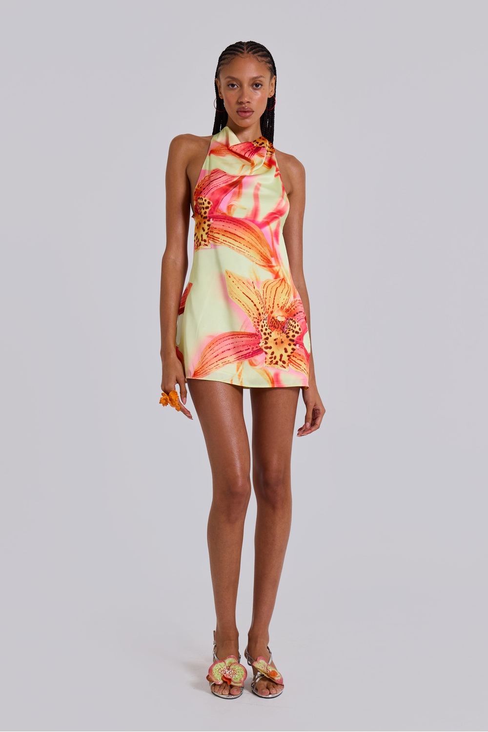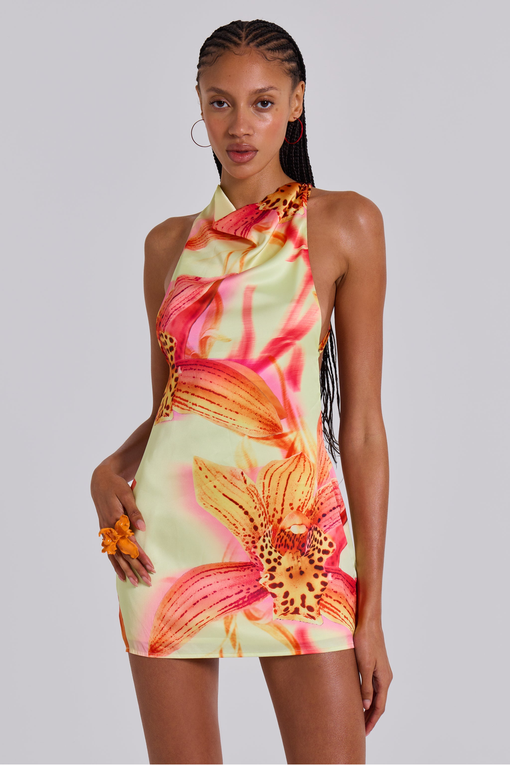 Turn heads in the Althea Mini Dress. Crafted from luxe satin and adorned with vivid orchid prints, this striking piece features a dramatic cowl neckline and an open back with delicate floral detail. Perfect for summer nights and tropical escapes.