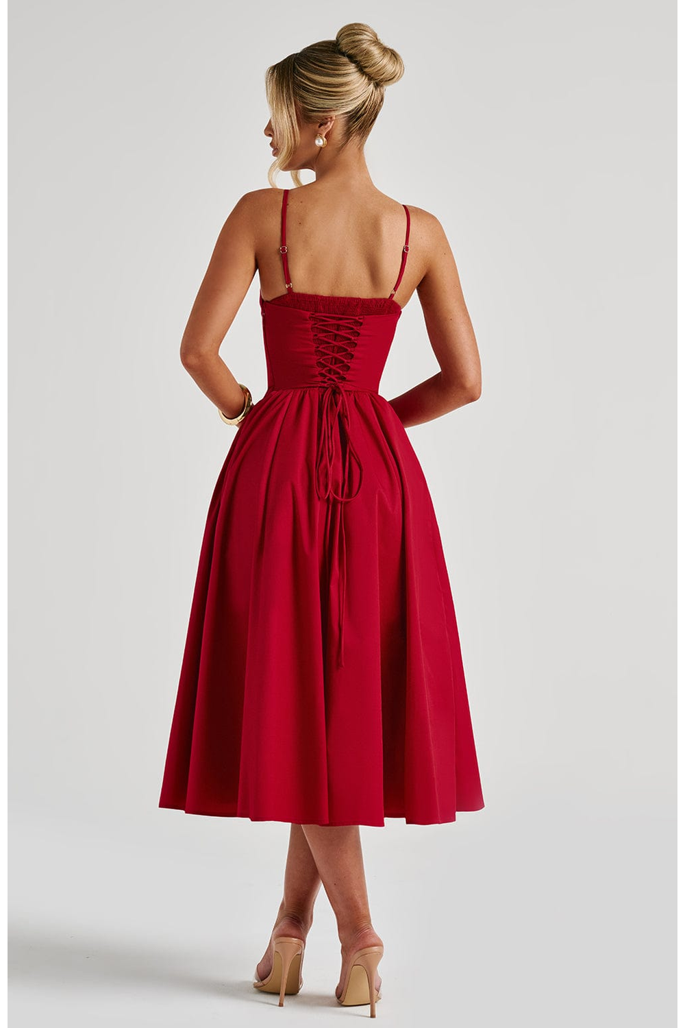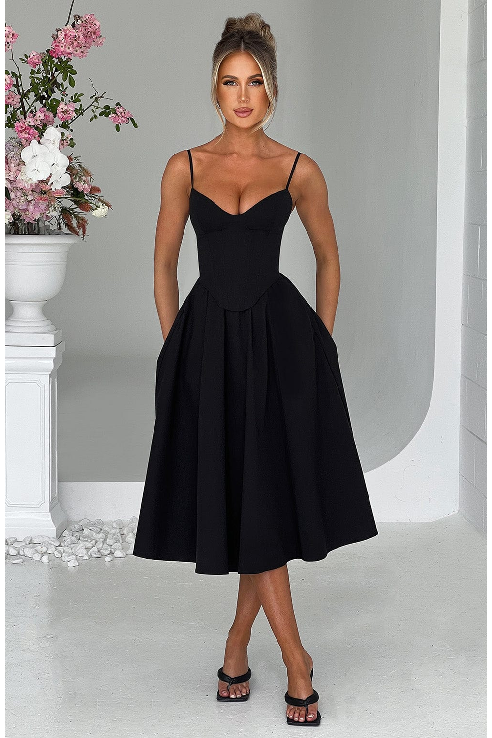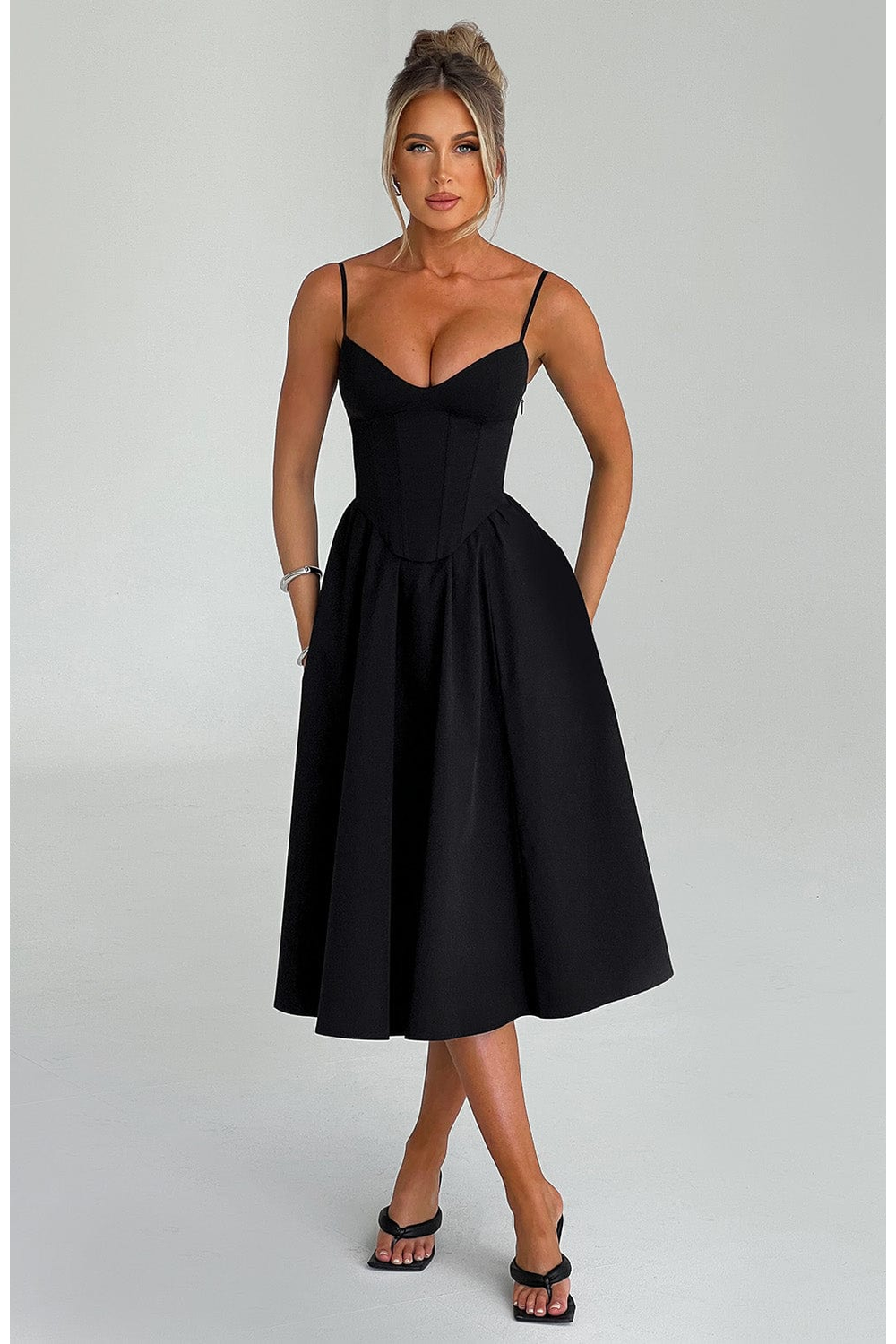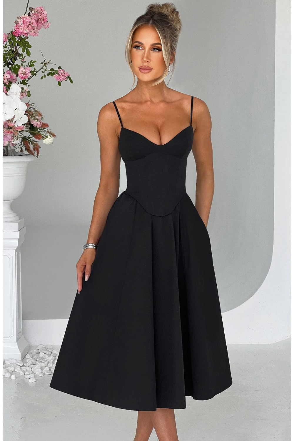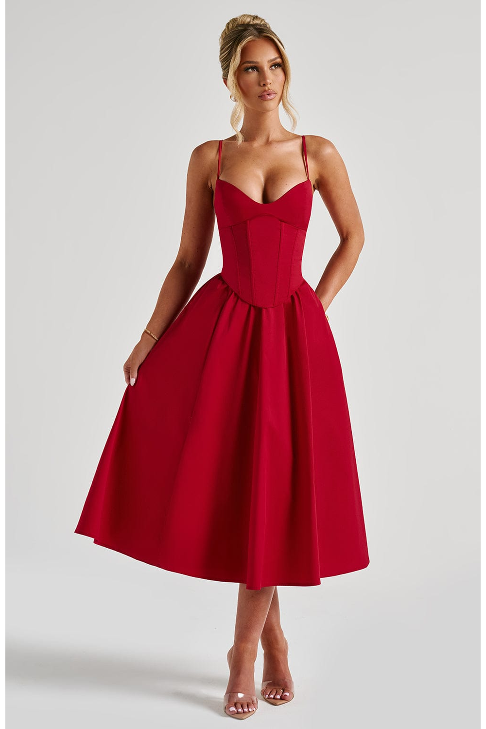 Bold, structured, and made to captivate, the Amara Midi Dress features a sculpted corset bodice and a voluminous skirt for show-stopping movement and shape. Perfect for formal evenings and unforgettable moments.