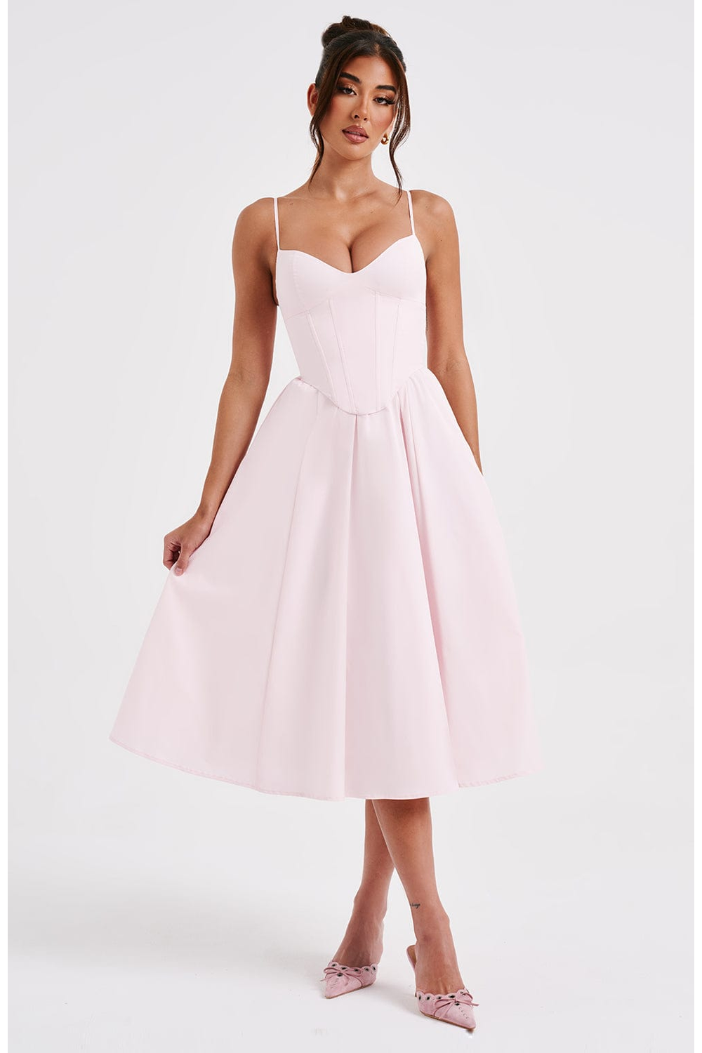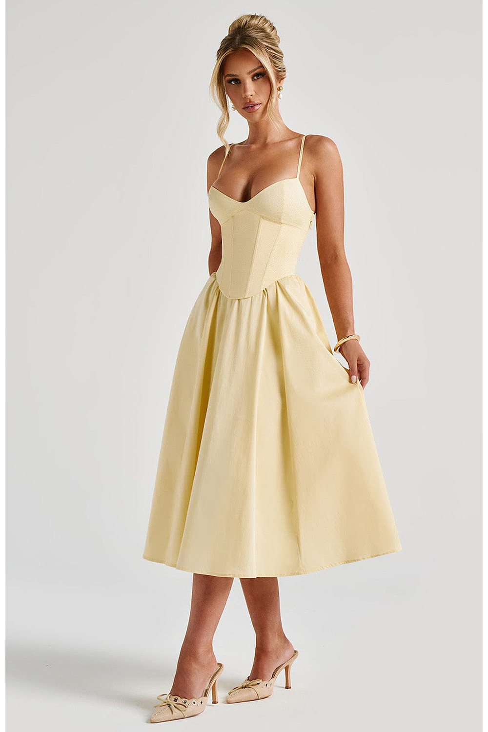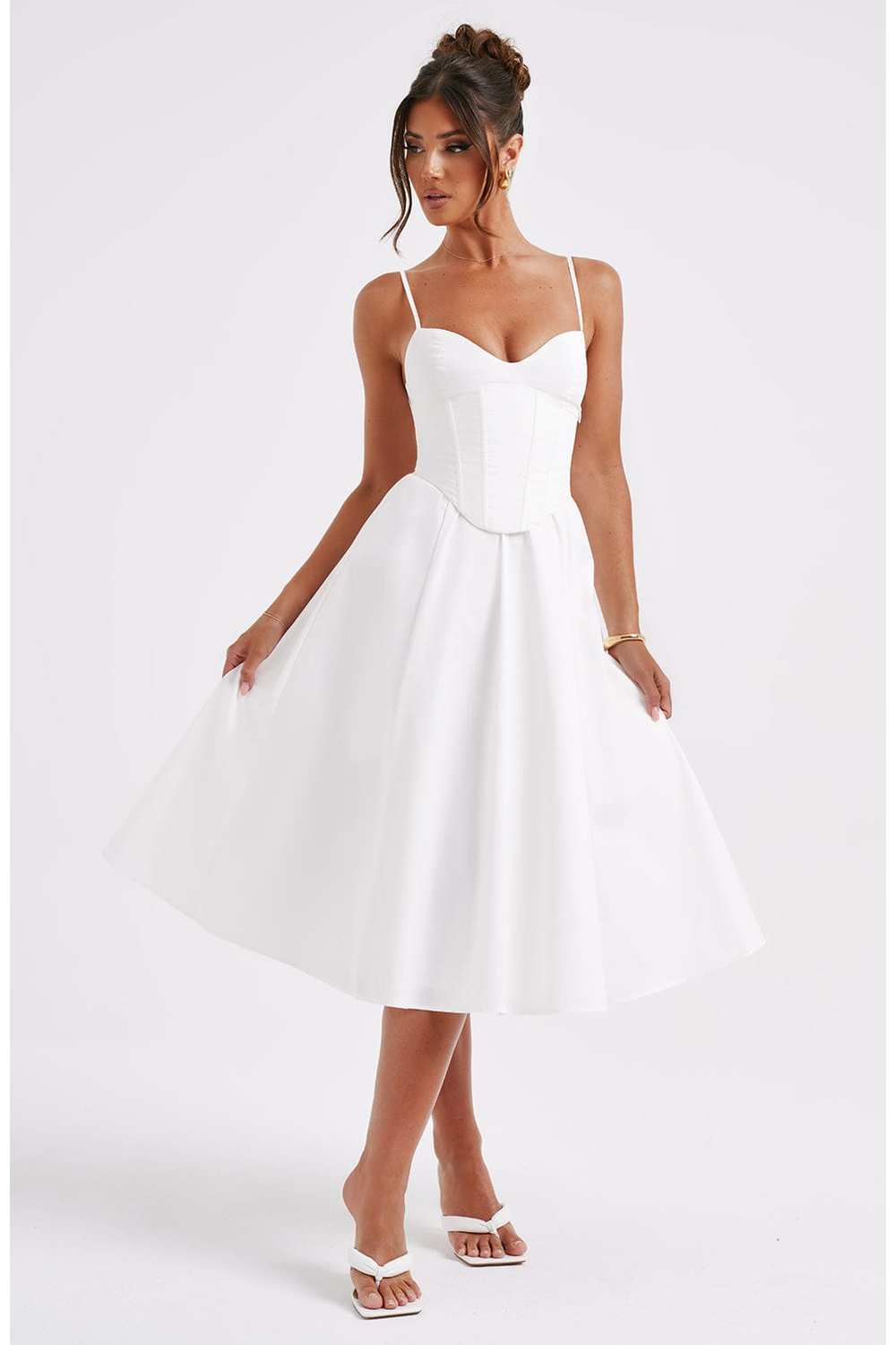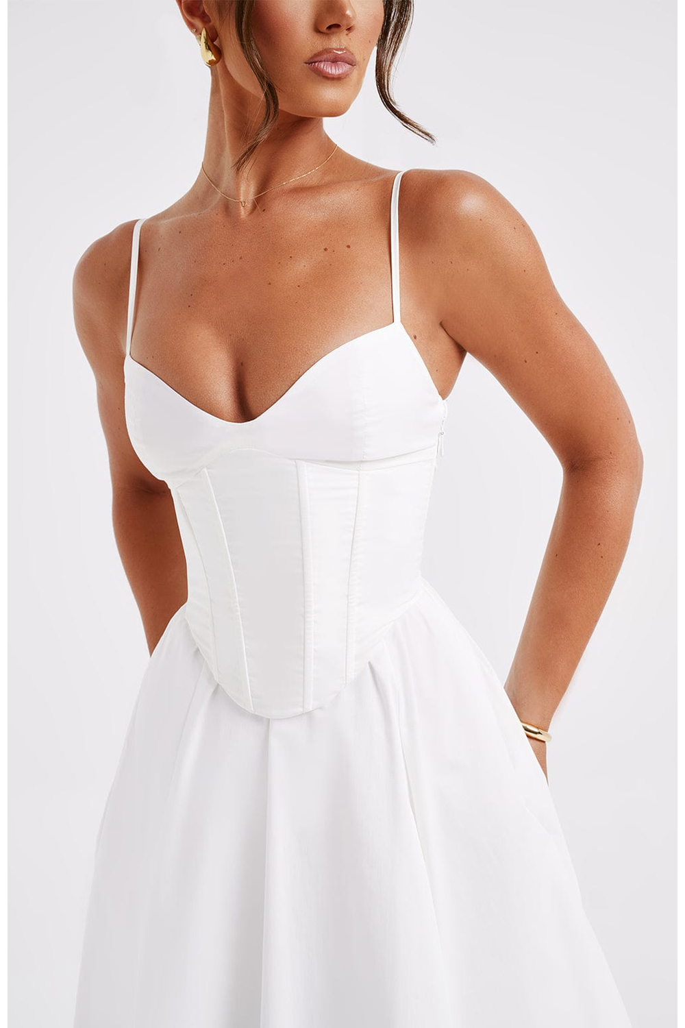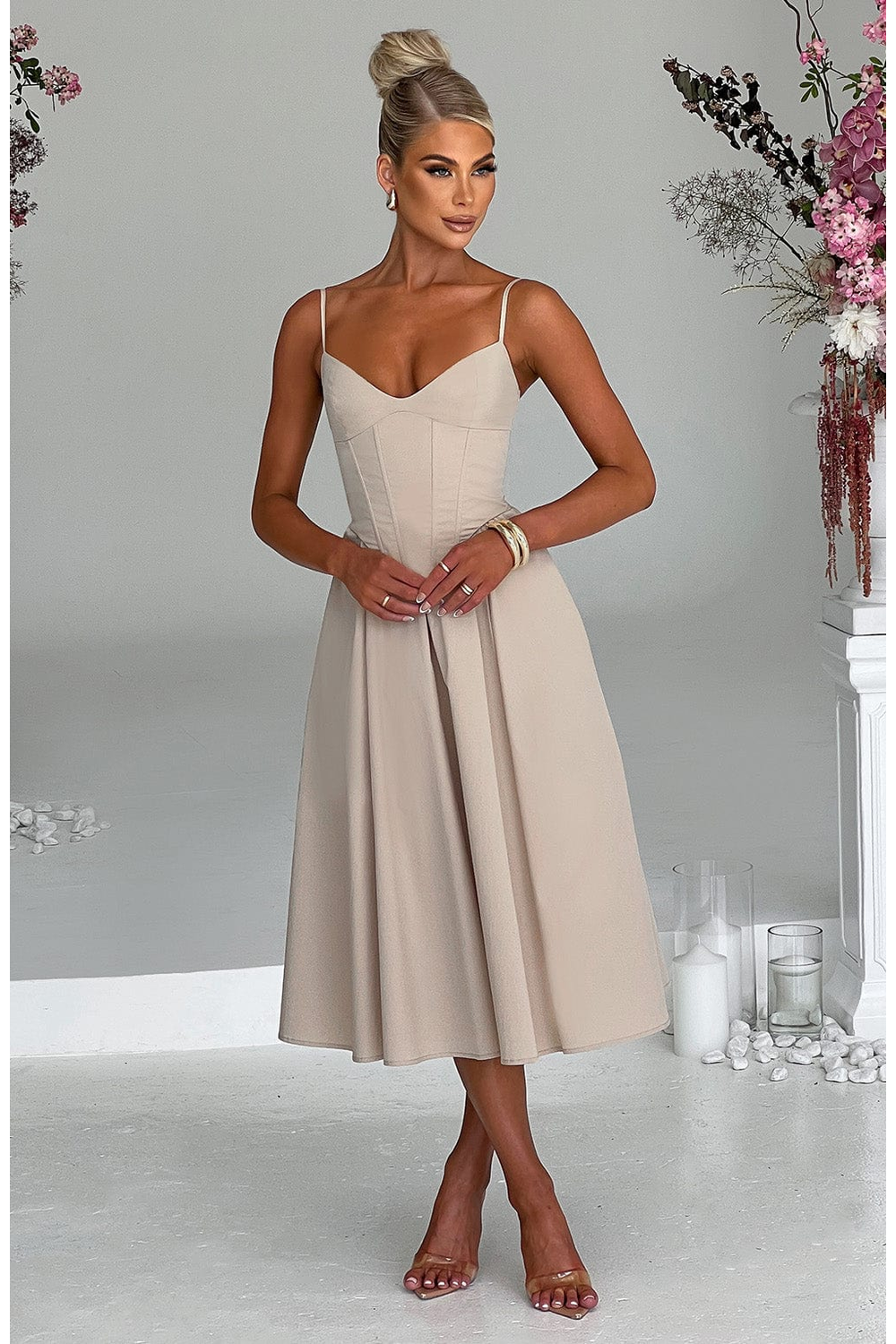 Bold, structured, and made to captivate, the Amara Midi Dress features a sculpted corset bodice and a voluminous skirt for show-stopping movement and shape. Perfect for formal evenings and unforgettable moments.
