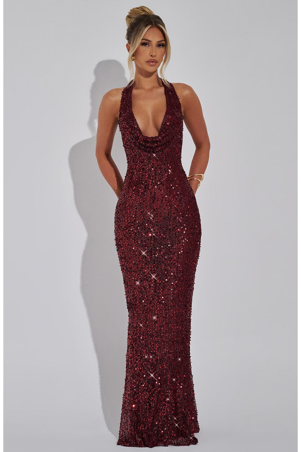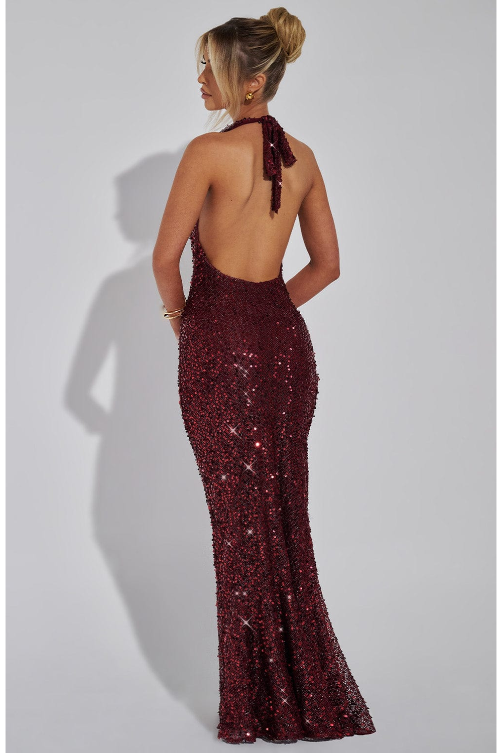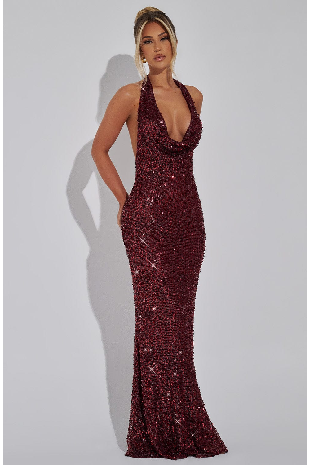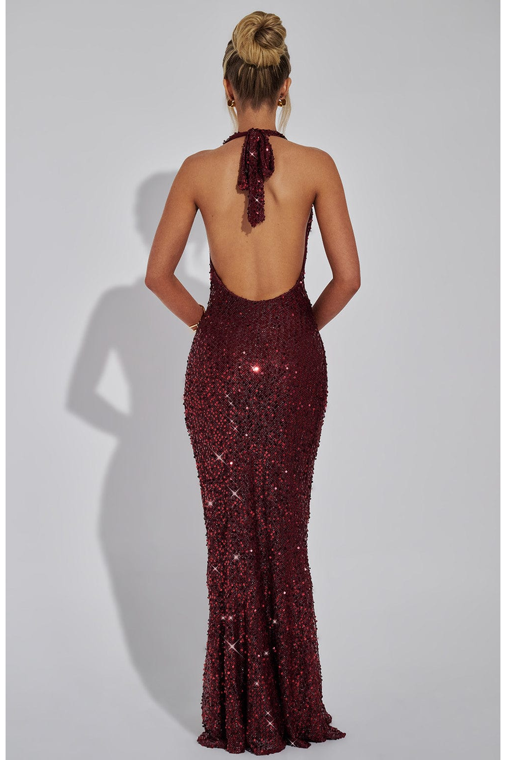 You’ll shine all night in the Aria Maxi Dress. Made from luxury sequin net with a touch of sheer allure, this dress is fully lined in mesh and designed to turn heads. Featuring elegant halterneck ties, a low cowl neckline, and a dramatic open back, Aria flows into a softly flared hem with a diagonal seam for added movement and grace. Style it with glowing skin and a sleek bun for red-carpet glamour.