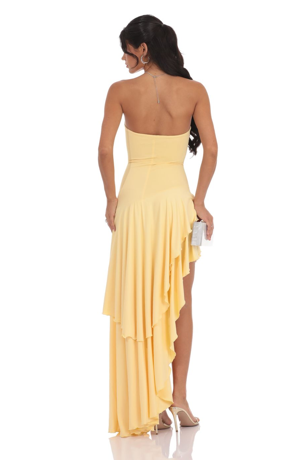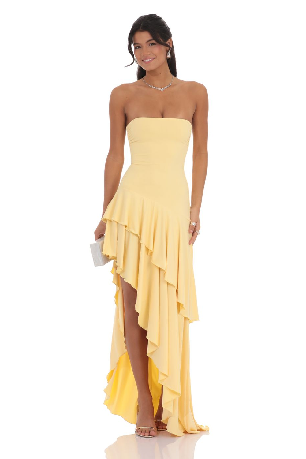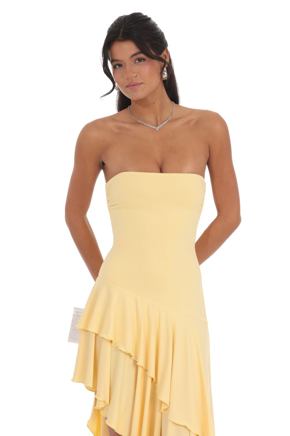 Soft, elegant and summer-ready. This strapless ruffle maxi flows with every step thanks to its asymmetric hemline, ideal for special evenings, coastal dinners or destination events.