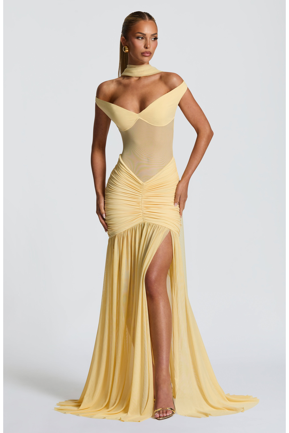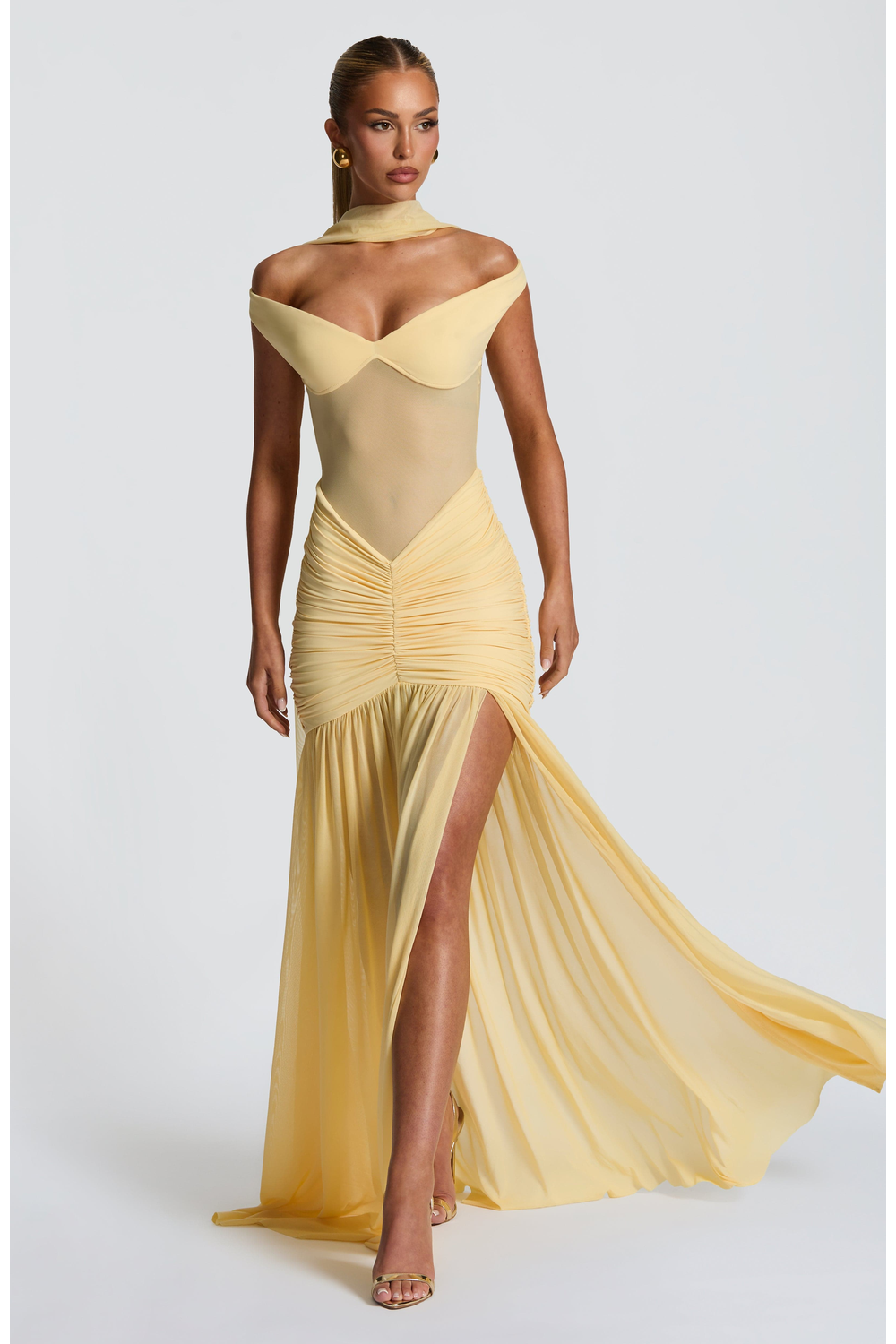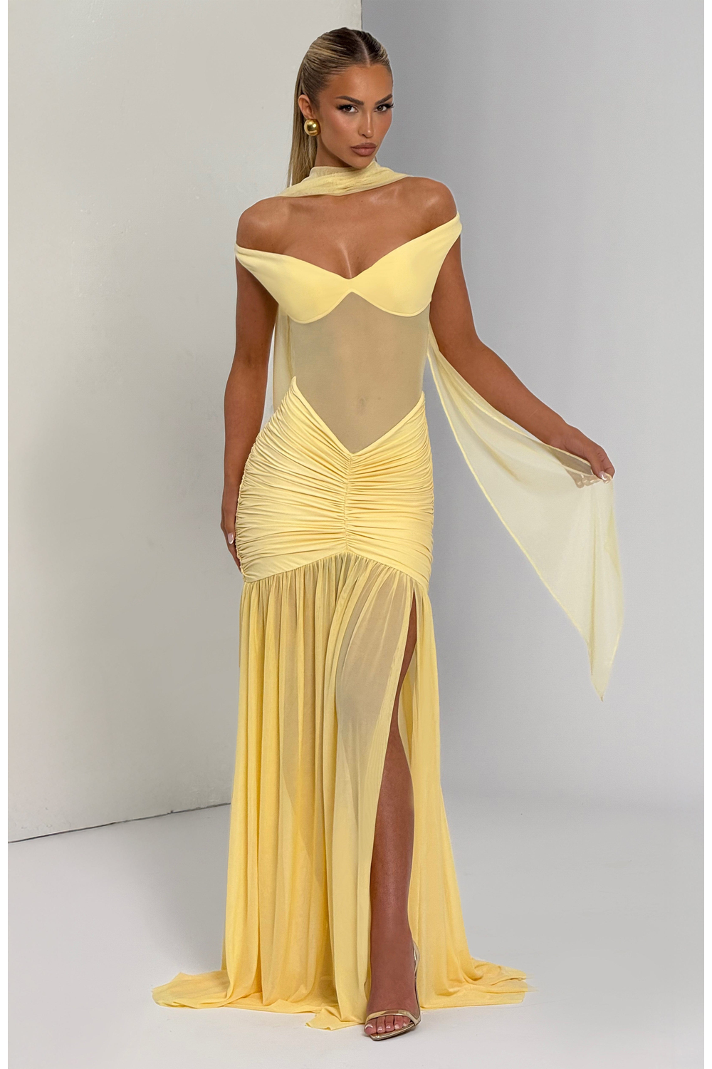 Make a stunning statement in the Celeste Maxi Dress, where dreamy elegance meets bold design. This lemon-hued beauty features a sheer mesh bodice that contours the figure, enhanced by a bardot neckline and sweetheart cups for a romantic yet daring edge. The dropped waist and ruched detailing flatter the hips, flowing into a full sheer skirt with a dramatic thigh-high split. Perfect for summer soirees, sunset weddings, or any moment you want to command attention.