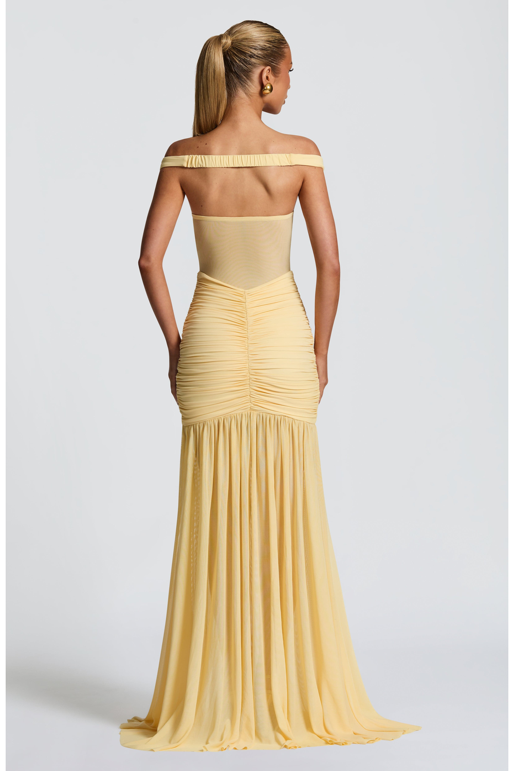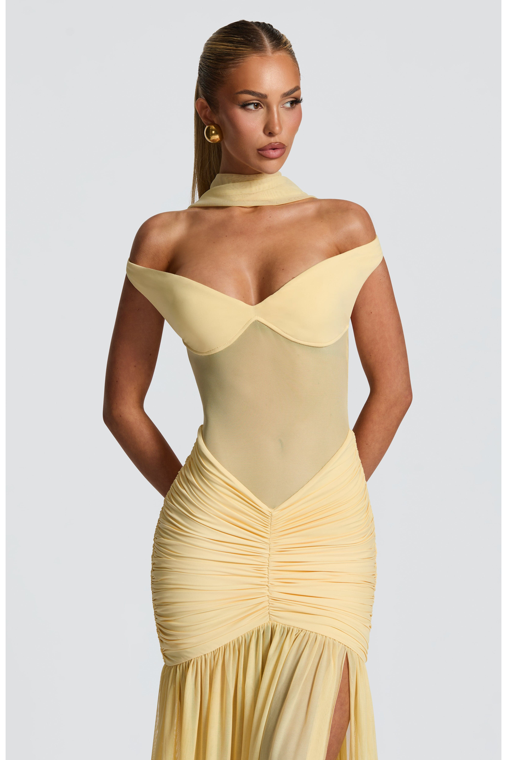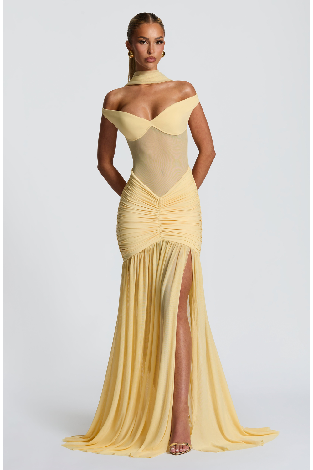 Make a stunning statement in the Celeste Maxi Dress, where dreamy elegance meets bold design. This lemon-hued beauty features a sheer mesh bodice that contours the figure, enhanced by a bardot neckline and sweetheart cups for a romantic yet daring edge. The dropped waist and ruched detailing flatter the hips, flowing into a full sheer skirt with a dramatic thigh-high split. Perfect for summer soirees, sunset weddings, or any moment you want to command attention.