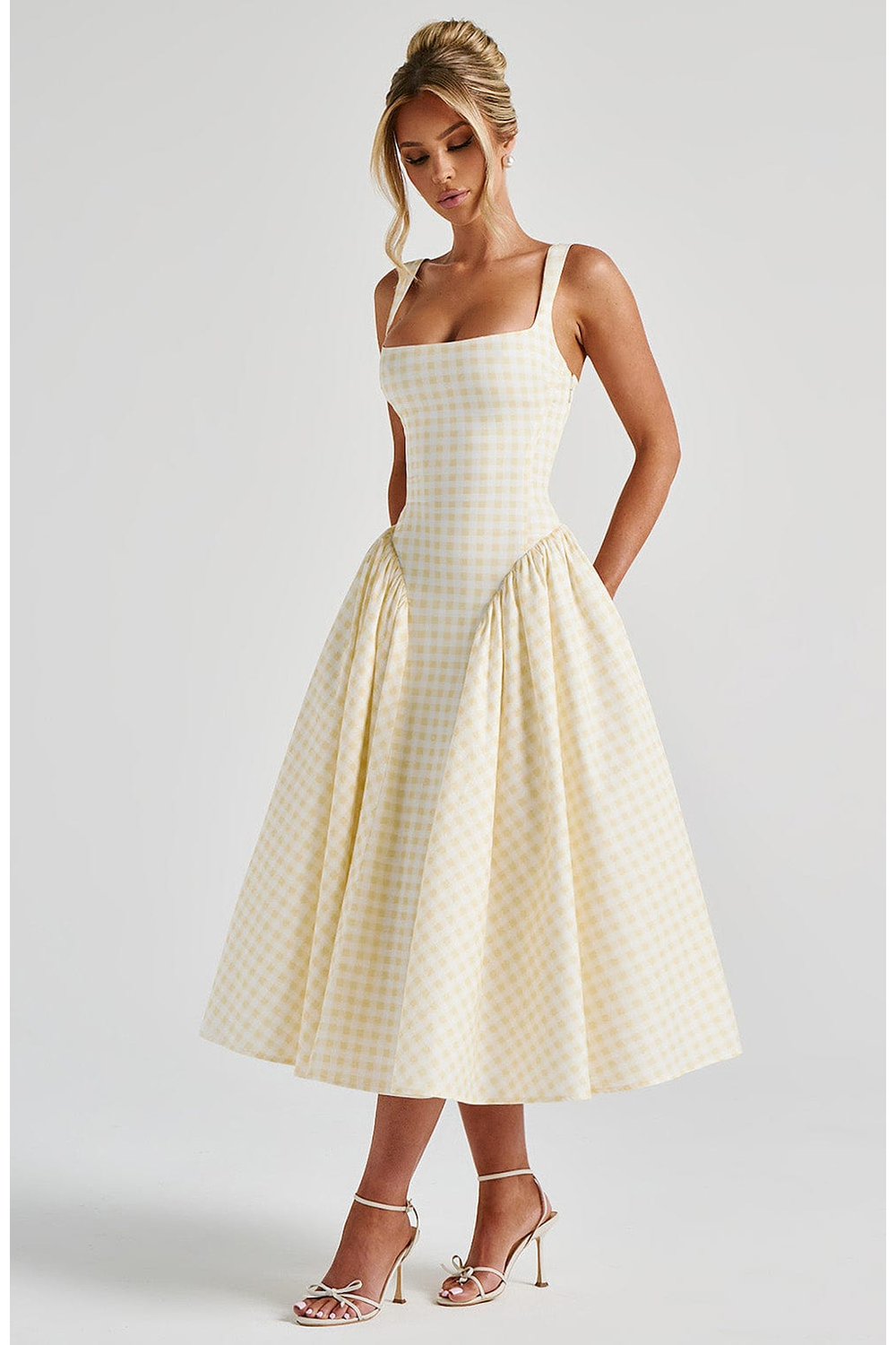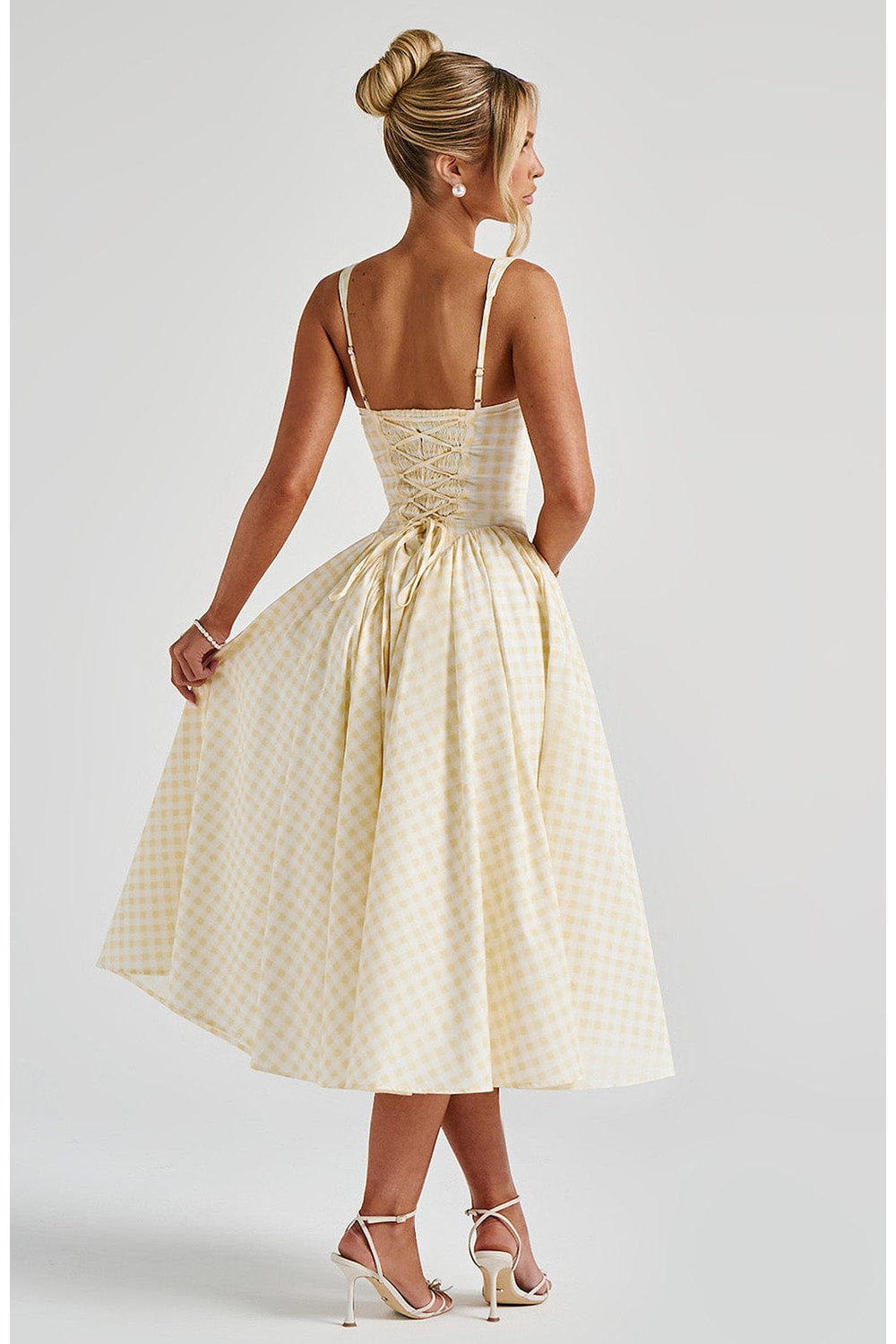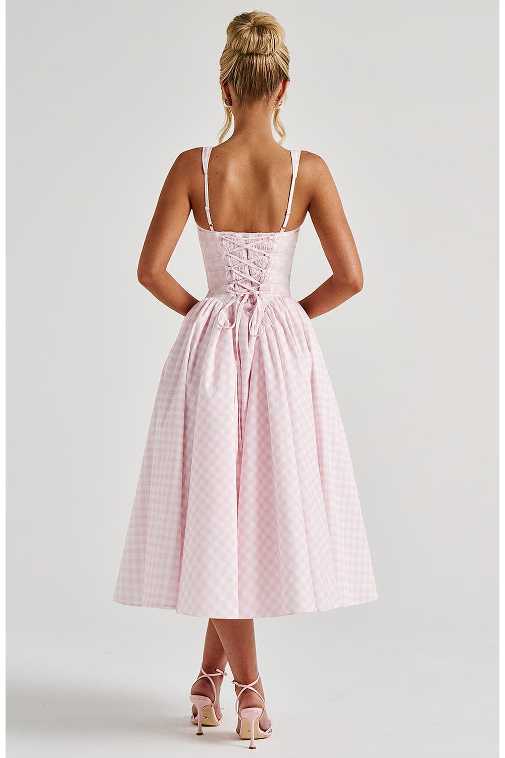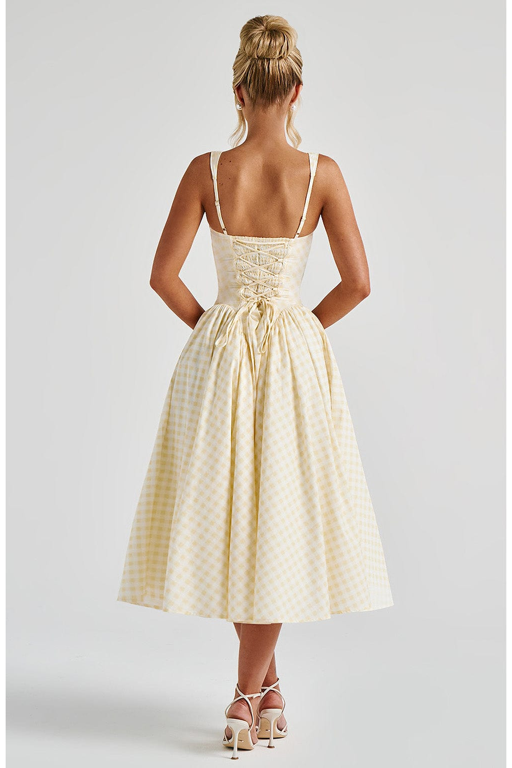 The Elowen Midi Dress pairs modern charm with vintage-inspired elegance. Crafted from breathable gingham voile, it features a structured bodice, adjustable lace-up back, and a flowing godet skirt for effortless movement and timeless appeal.