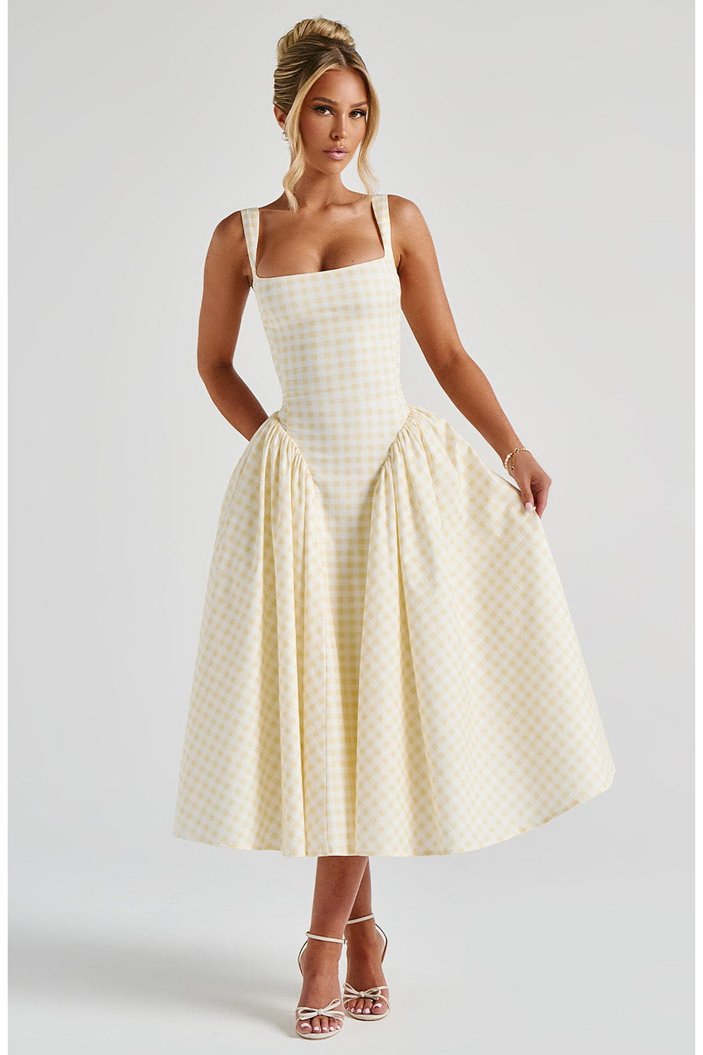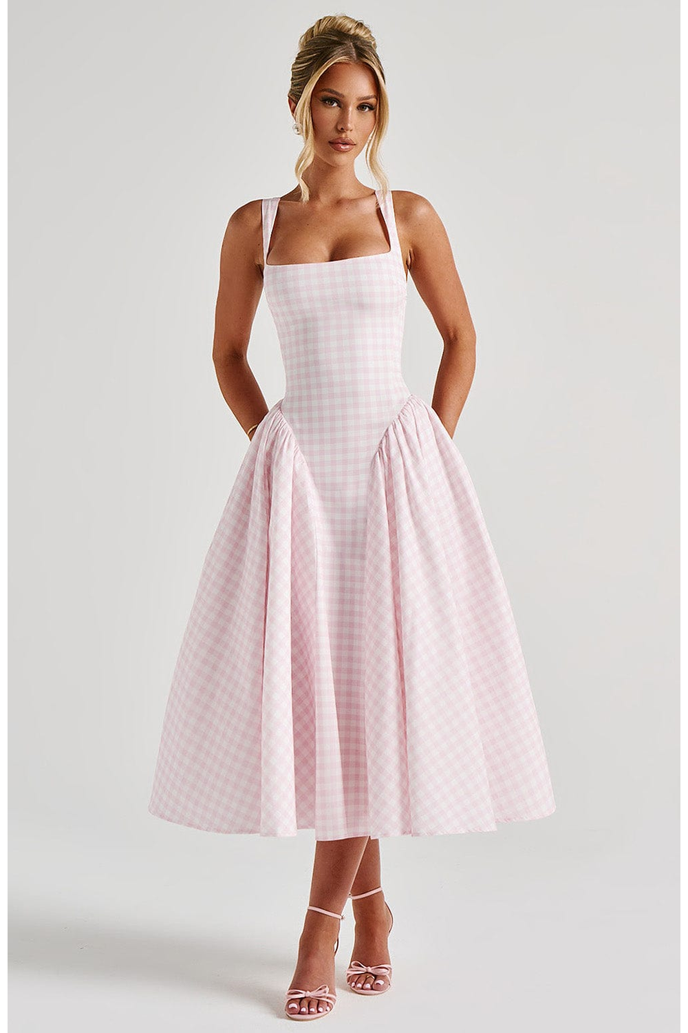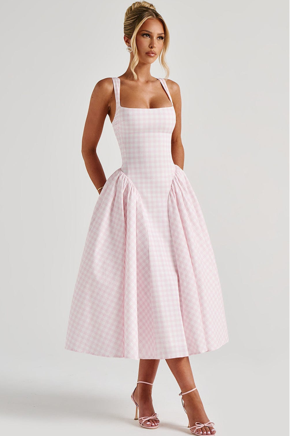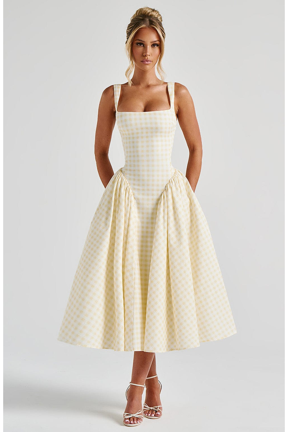 The Elowen Midi Dress pairs modern charm with vintage-inspired elegance. Crafted from breathable gingham voile, it features a structured bodice, adjustable lace-up back, and a flowing godet skirt for effortless movement and timeless appeal.