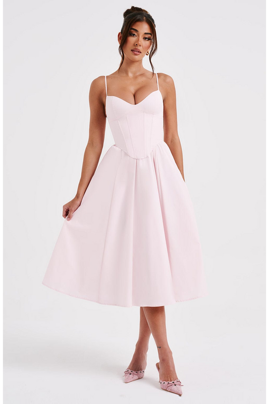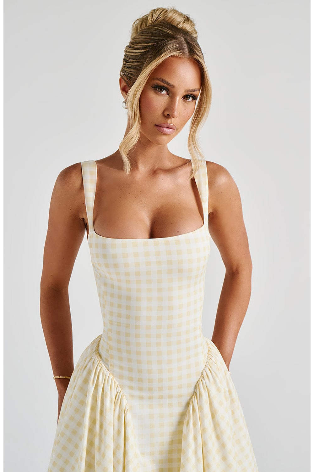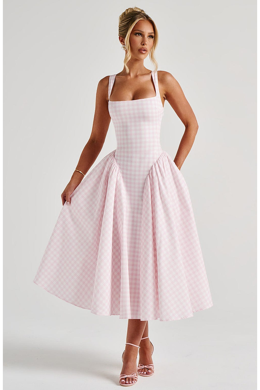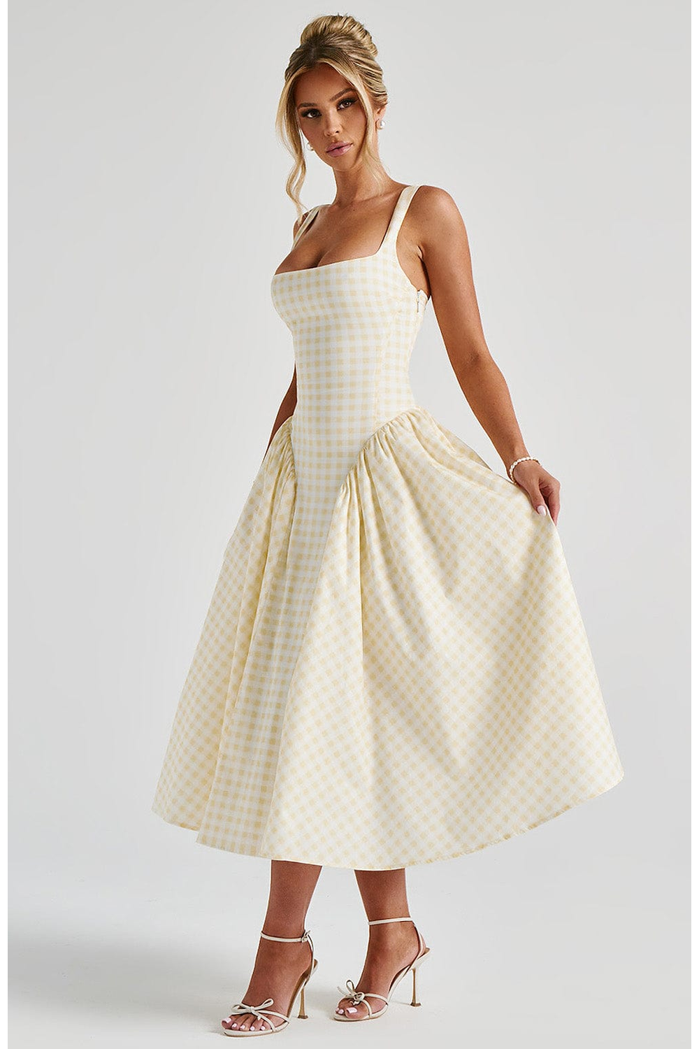 The Elowen Midi Dress pairs modern charm with vintage-inspired elegance. Crafted from breathable gingham voile, it features a structured bodice, adjustable lace-up back, and a flowing godet skirt for effortless movement and timeless appeal.