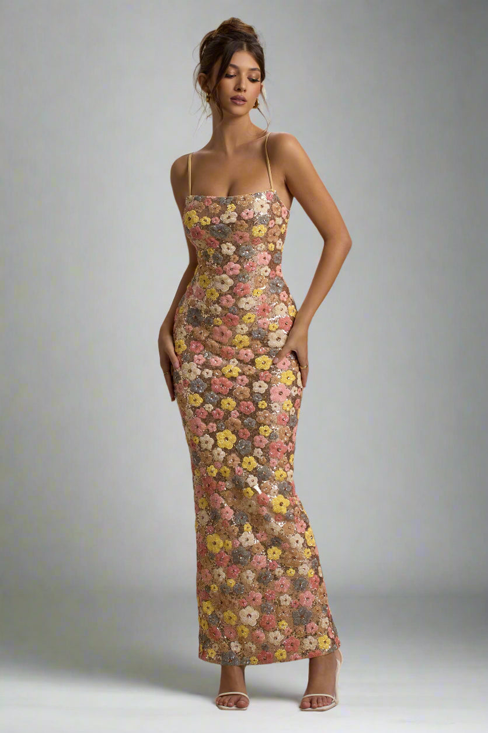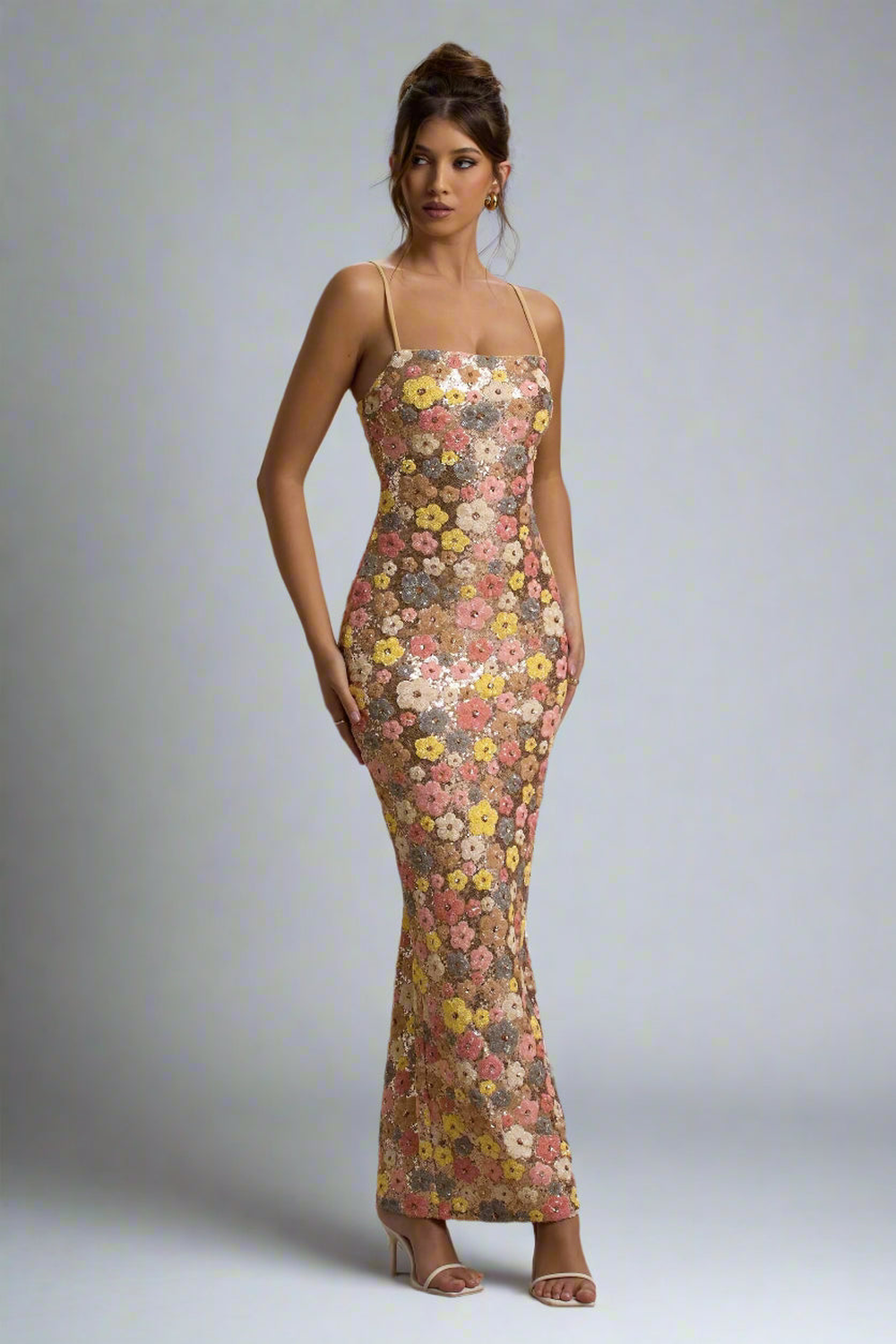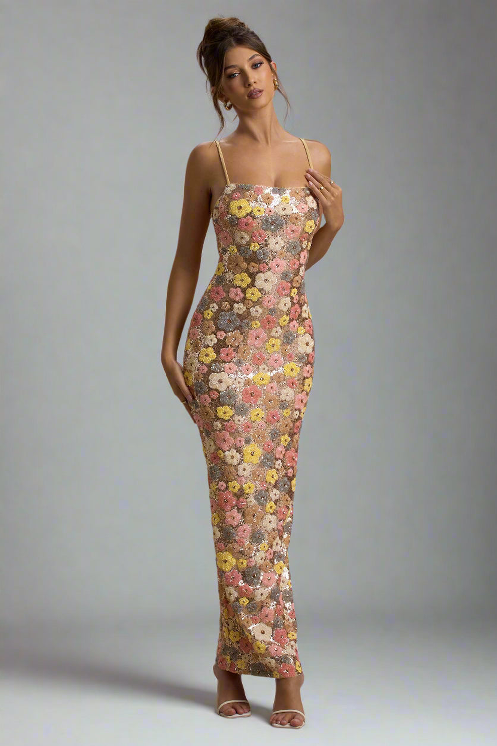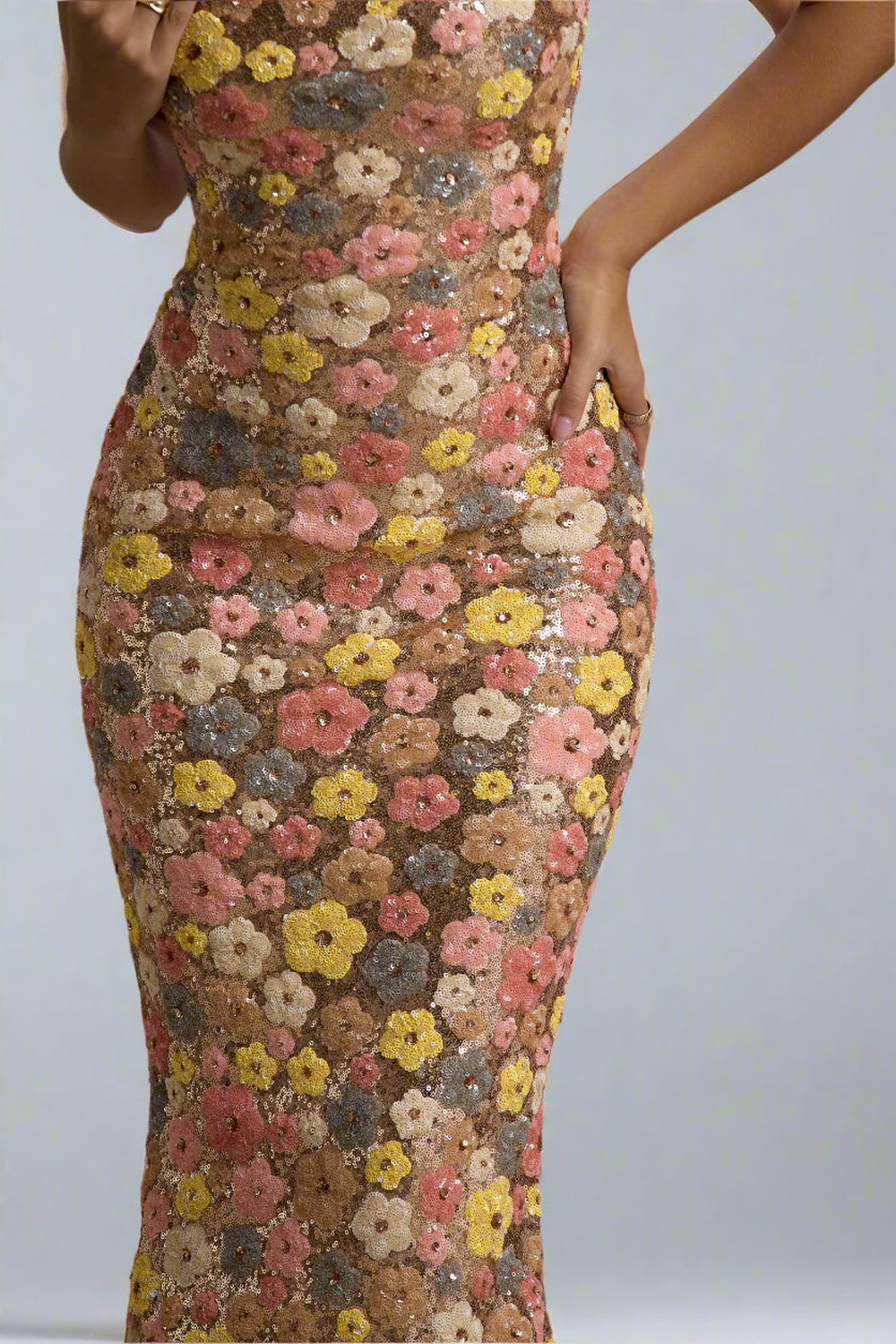 Step into sparkle with this show-stopping floral maxi. Covered in pastel sequins and finished with a side split, it’s made for garden parties and glamorous summer soirées.