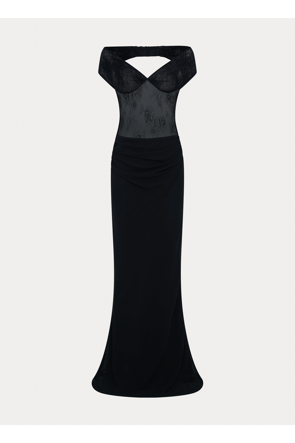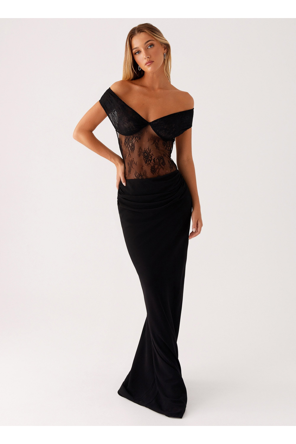 The Julissa Maxi Dress is made for twilight entrances and golden hour glamour. Featuring an off-shoulder neckline and sheer lace bodice, this curve-hugging silhouette falls into a floor-sweeping maxi with an open back for added allure. Whether it’s a rooftop dinner or a black-tie affair, Julissa guarantees all eyes on you.