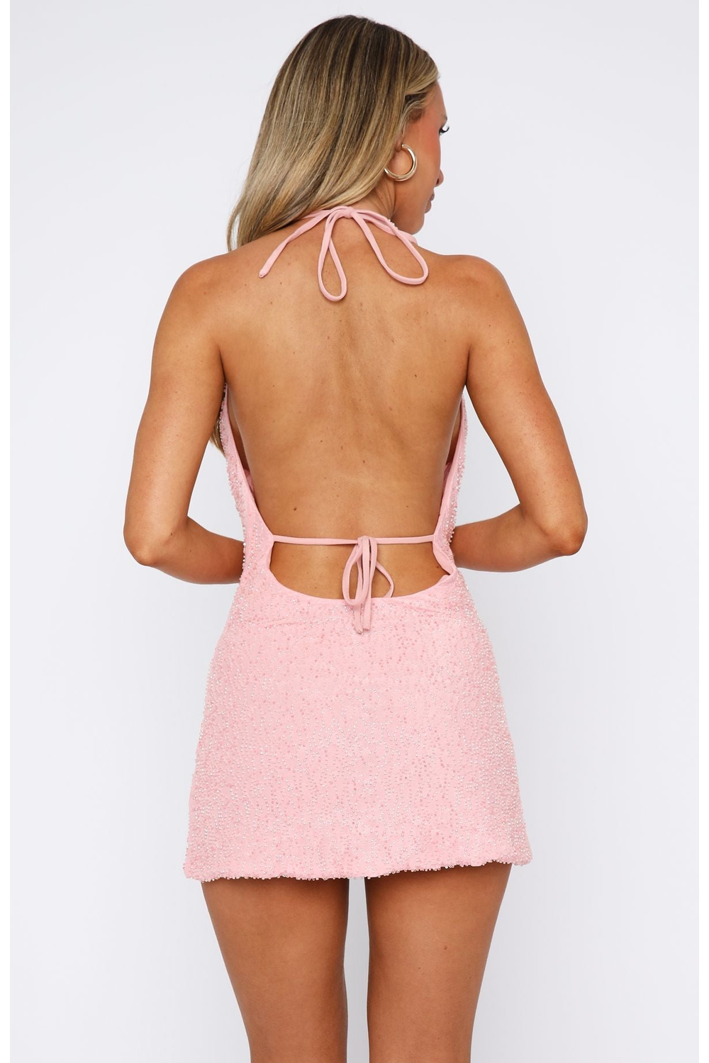 Light up the night in the Liora Mini Dress. Designed in soft baby pink with all-over hand-beaded shimmer, this showstopper brings elegance and seduction together. The draped cowl neckline and backless halter silhouette are made for moonlit moments and dance-floor drama.