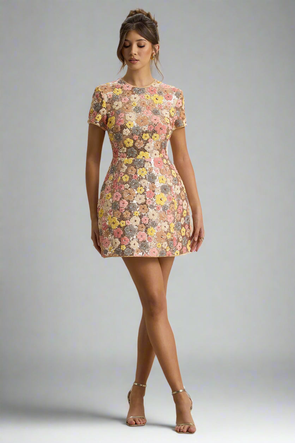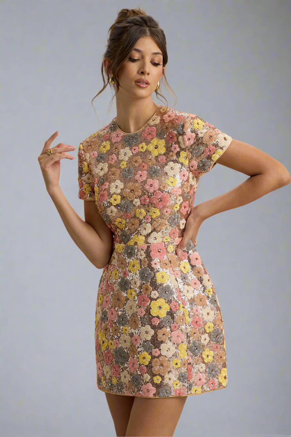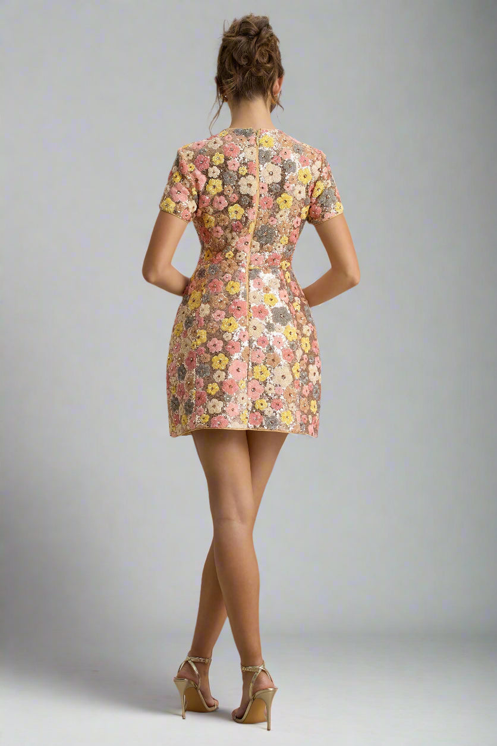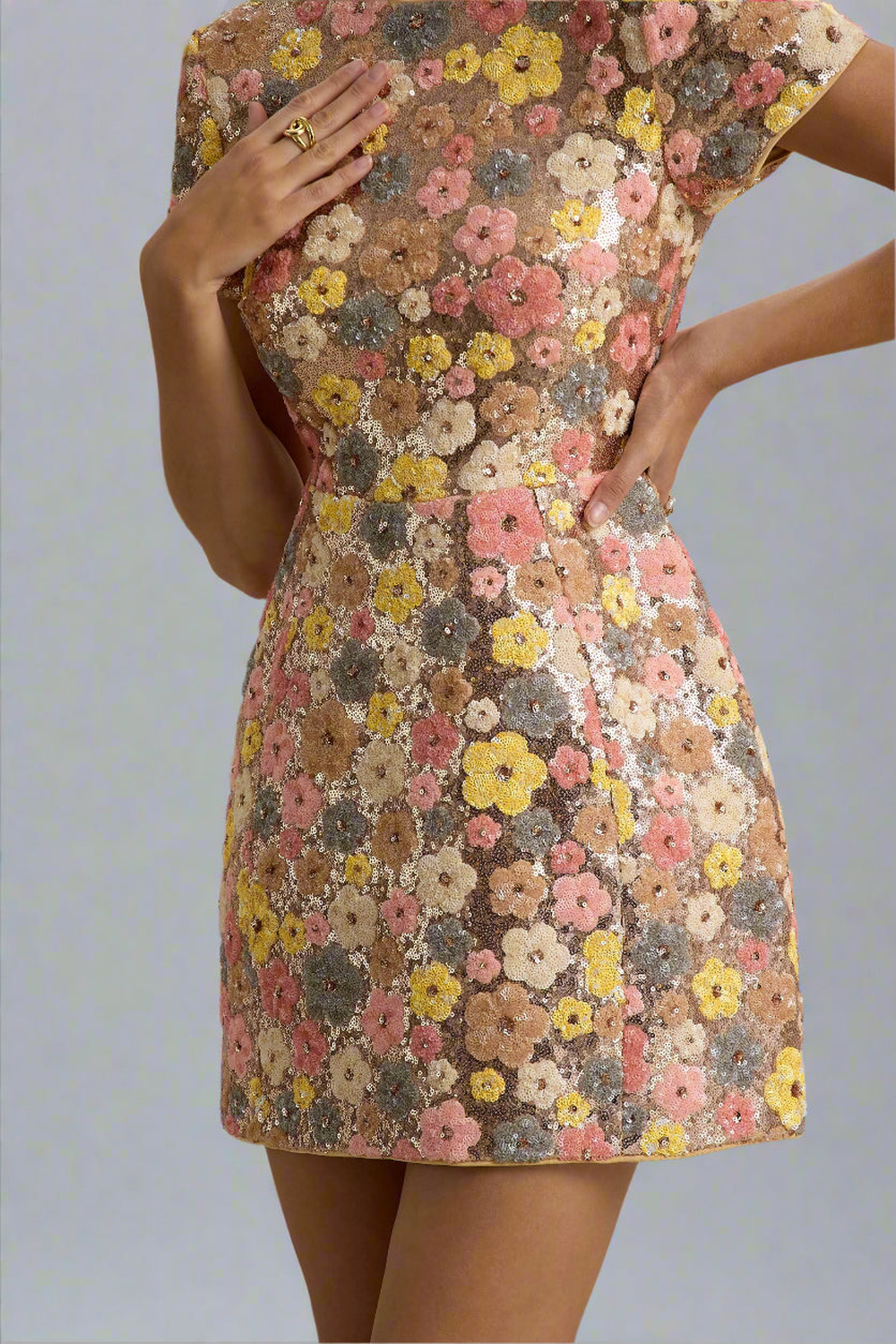 Step into the spotlight with the Lucina Mini Dress. Crafted in pastel floral sequin and cut into a flattering mini silhouette, it’s made for moments worth remembering. The high crew neckline and short sleeves balance the shimmer with timeless elegance, an instant go-to for weddings, cocktail parties, or elevated nights out.