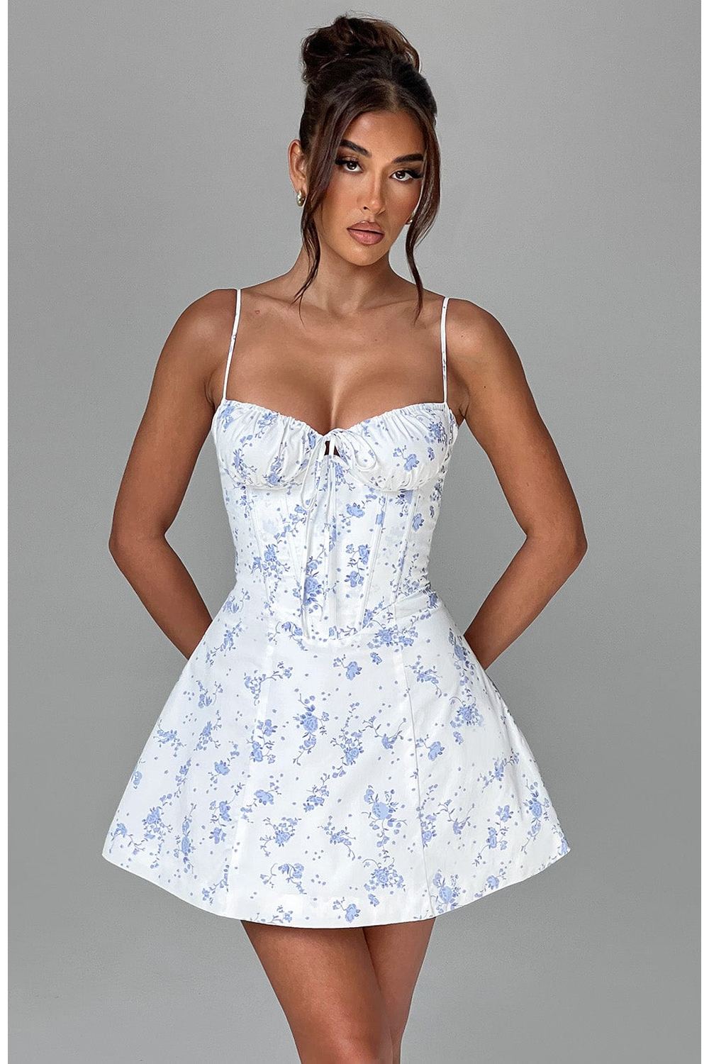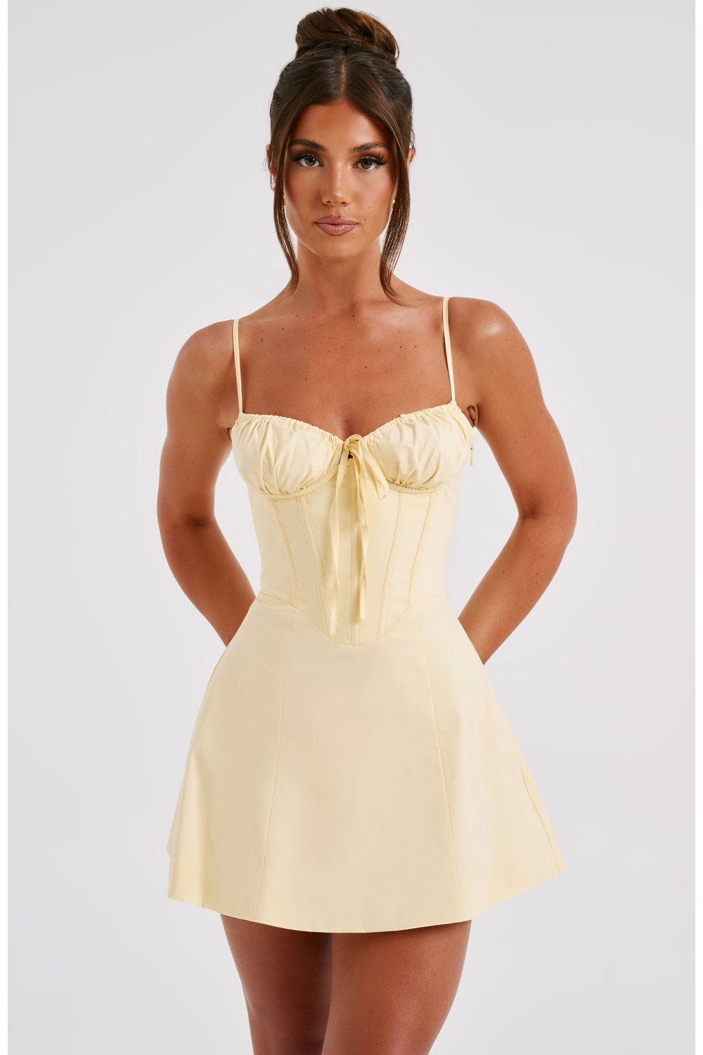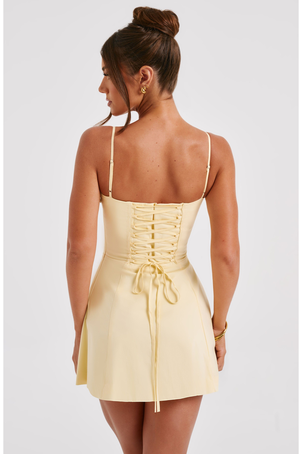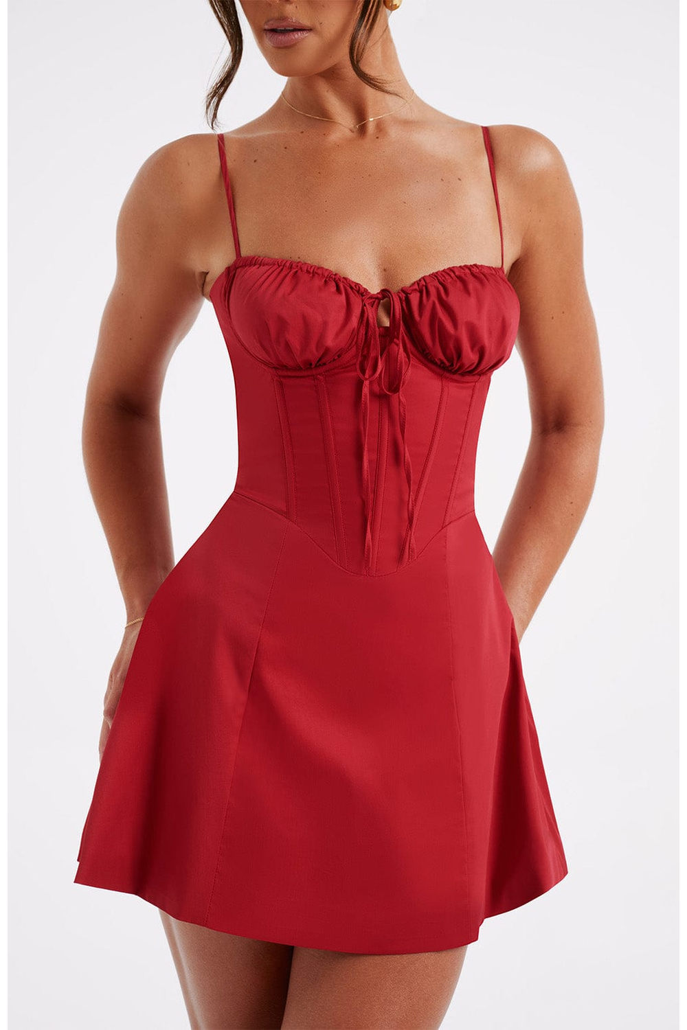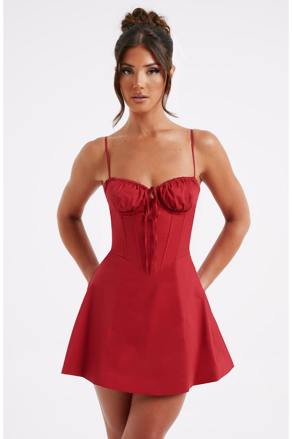 Flirty and feminine, the Maribel Mini Dress features a sculpted boned bodice, underwired cups with a tie-front detail, and a lace-up back for the perfect fit. Finished with a voluminous skirt, it’s made for garden parties, brunch dates, and sun-drenched strolls.
