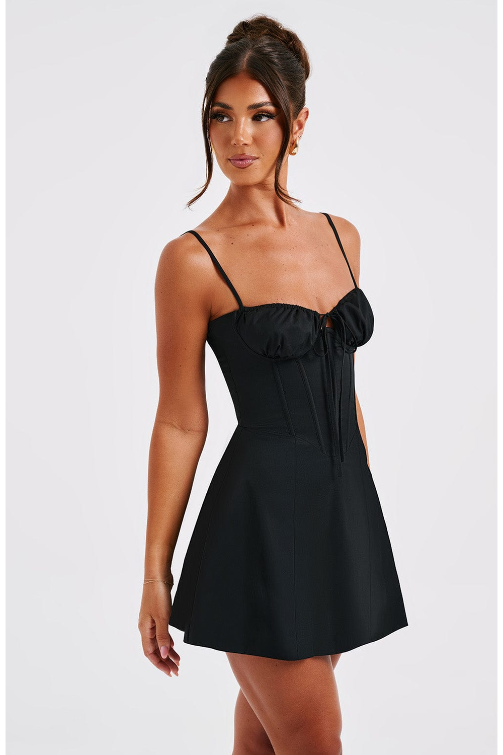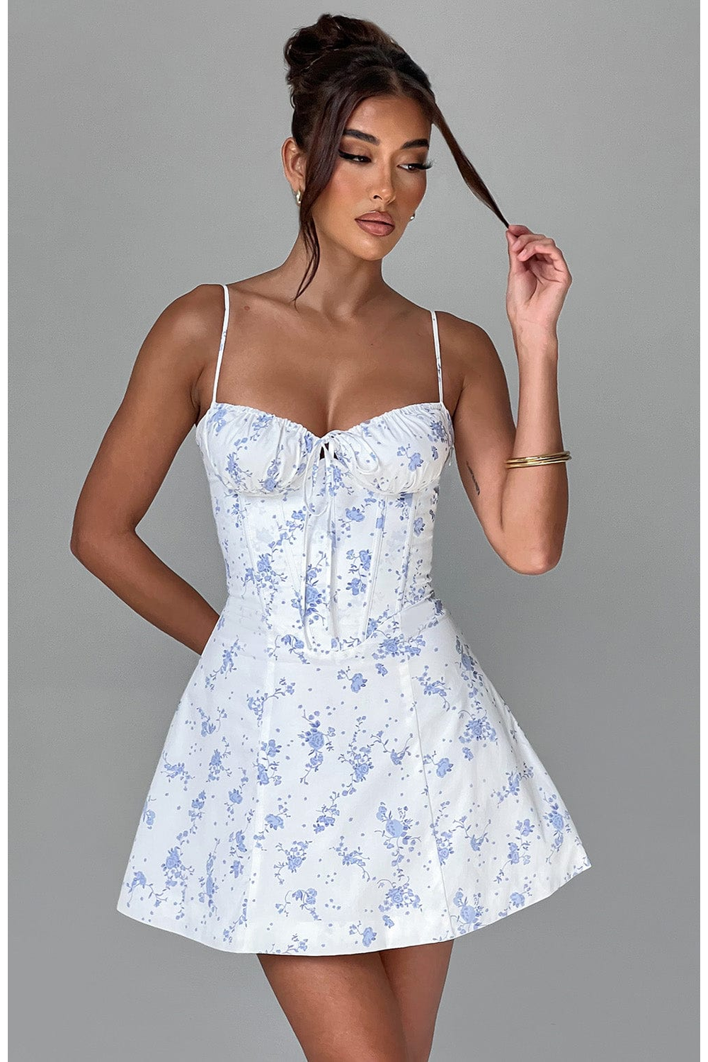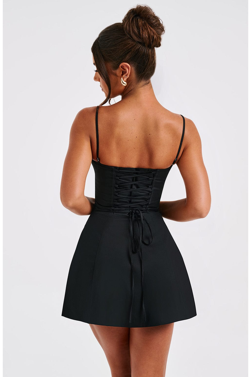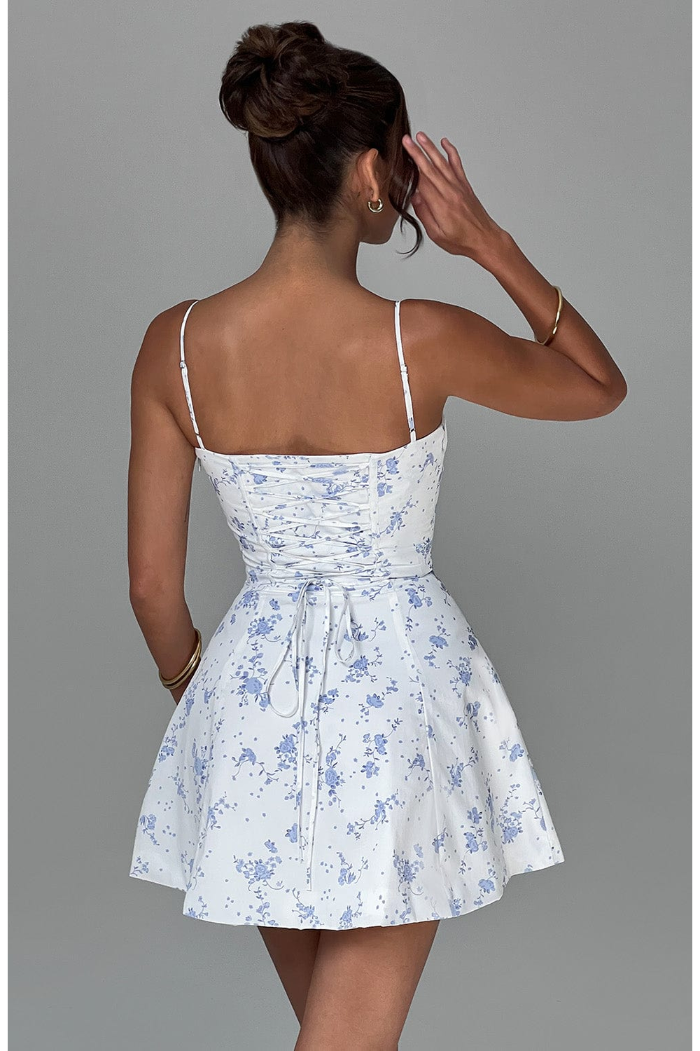 Flirty and feminine, the Maribel Mini Dress features a sculpted boned bodice, underwired cups with a tie-front detail, and a lace-up back for the perfect fit. Finished with a voluminous skirt, it’s made for garden parties, brunch dates, and sun-drenched strolls.