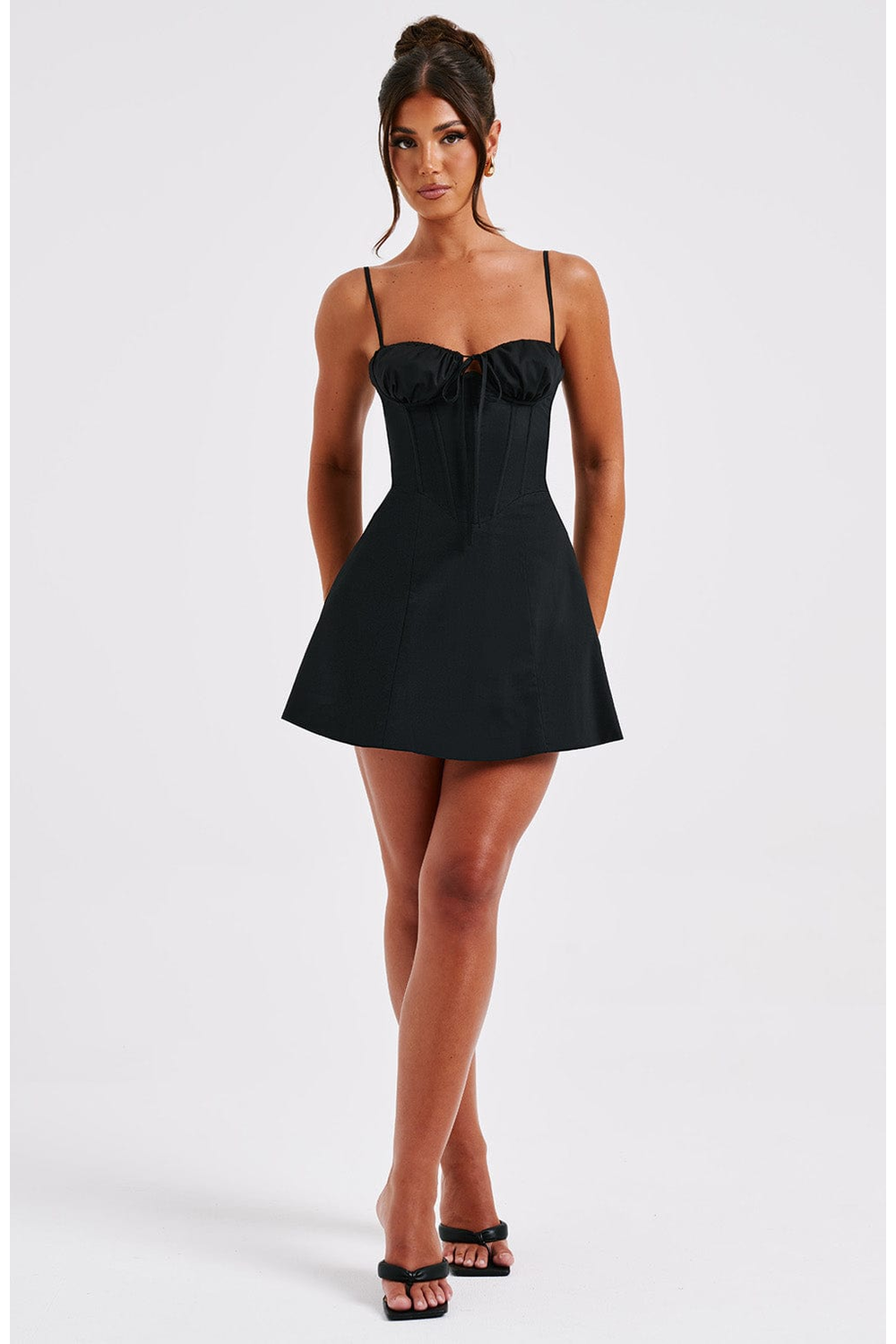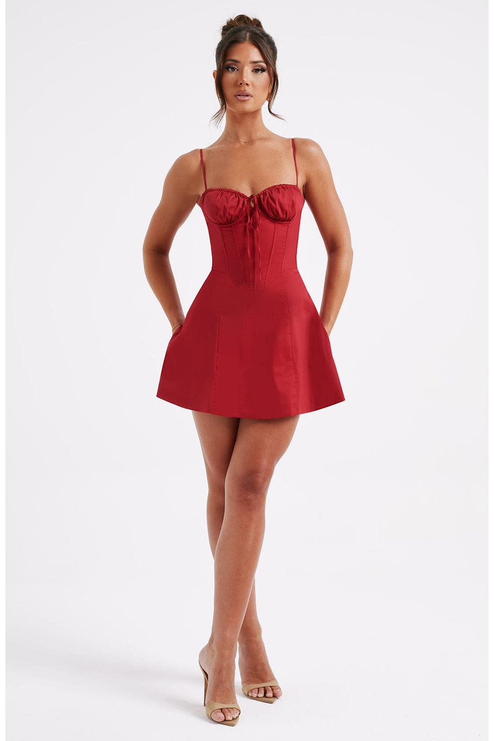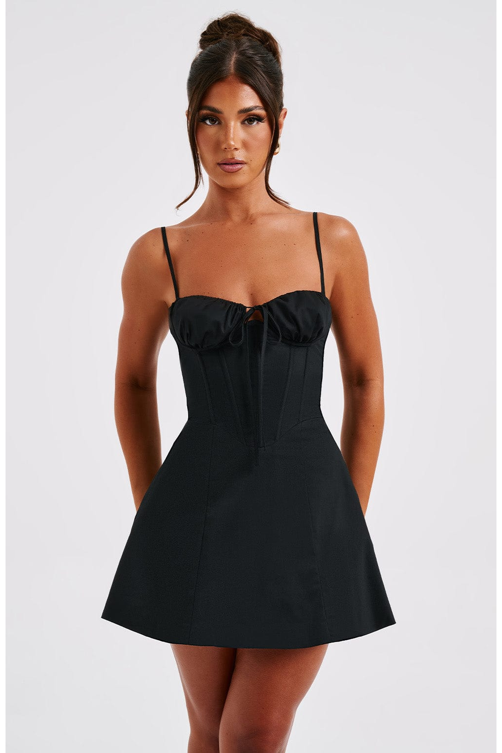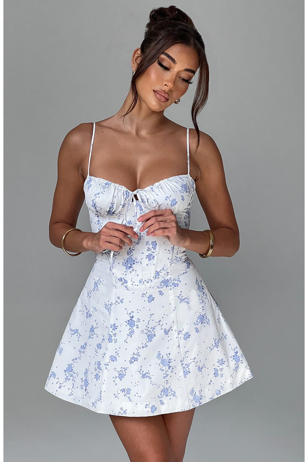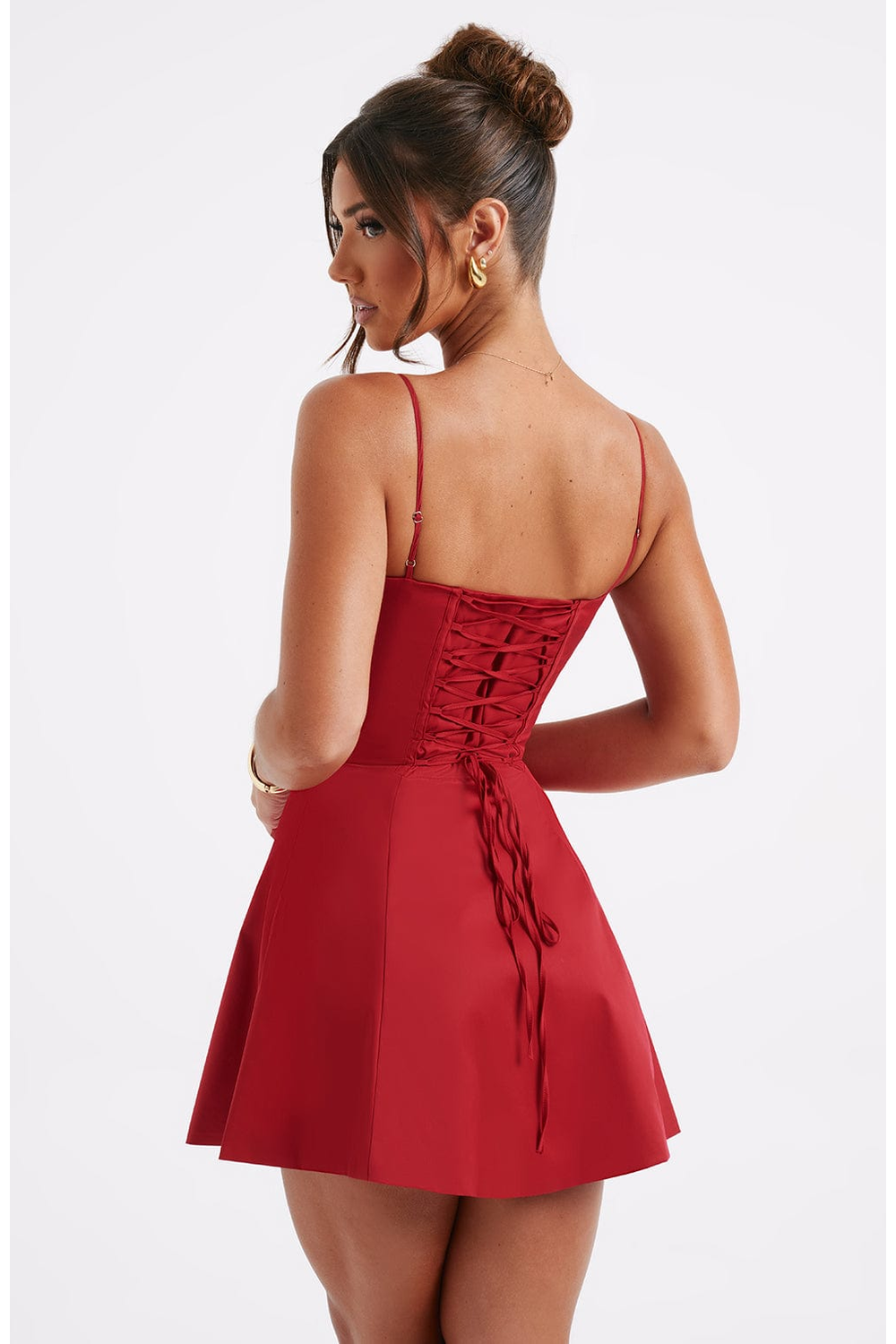 Flirty and feminine, the Maribel Mini Dress features a sculpted boned bodice, underwired cups with a tie-front detail, and a lace-up back for the perfect fit. Finished with a voluminous skirt, it’s made for garden parties, brunch dates, and sun-drenched strolls.