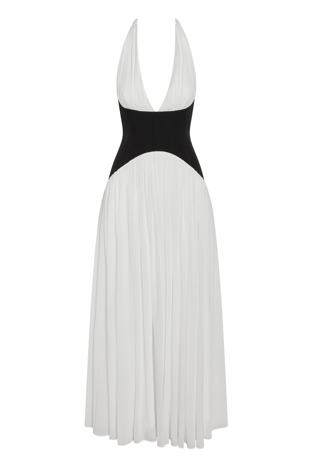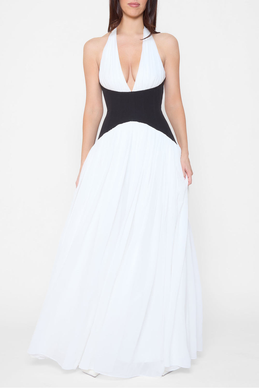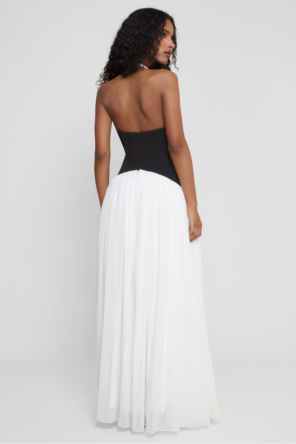 Where modern drama meets timeless romance. The Noirette Maxi Dress features soft white chiffon gathered at a sleek halter neckline, contrasted by a bold black corset waist. Designed to sculpt, flow, and leave a lasting impression.