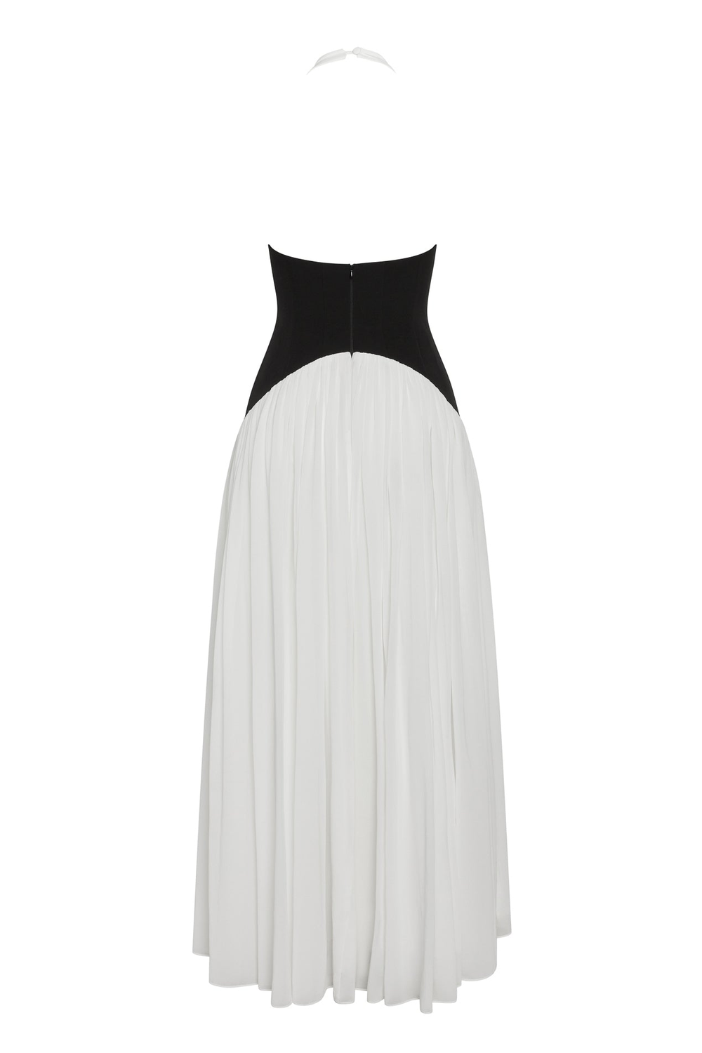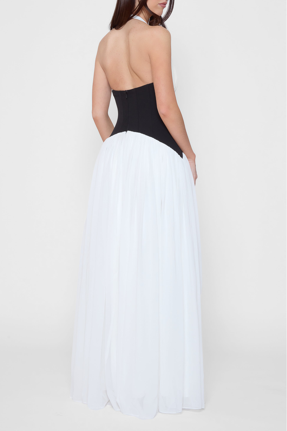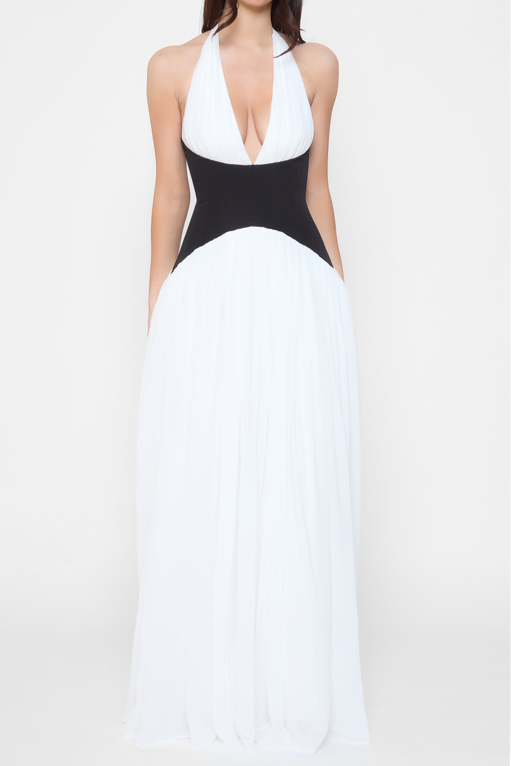 Where modern drama meets timeless romance. The Noirette Maxi Dress features soft white chiffon gathered at a sleek halter neckline, contrasted by a bold black corset waist. Designed to sculpt, flow, and leave a lasting impression.