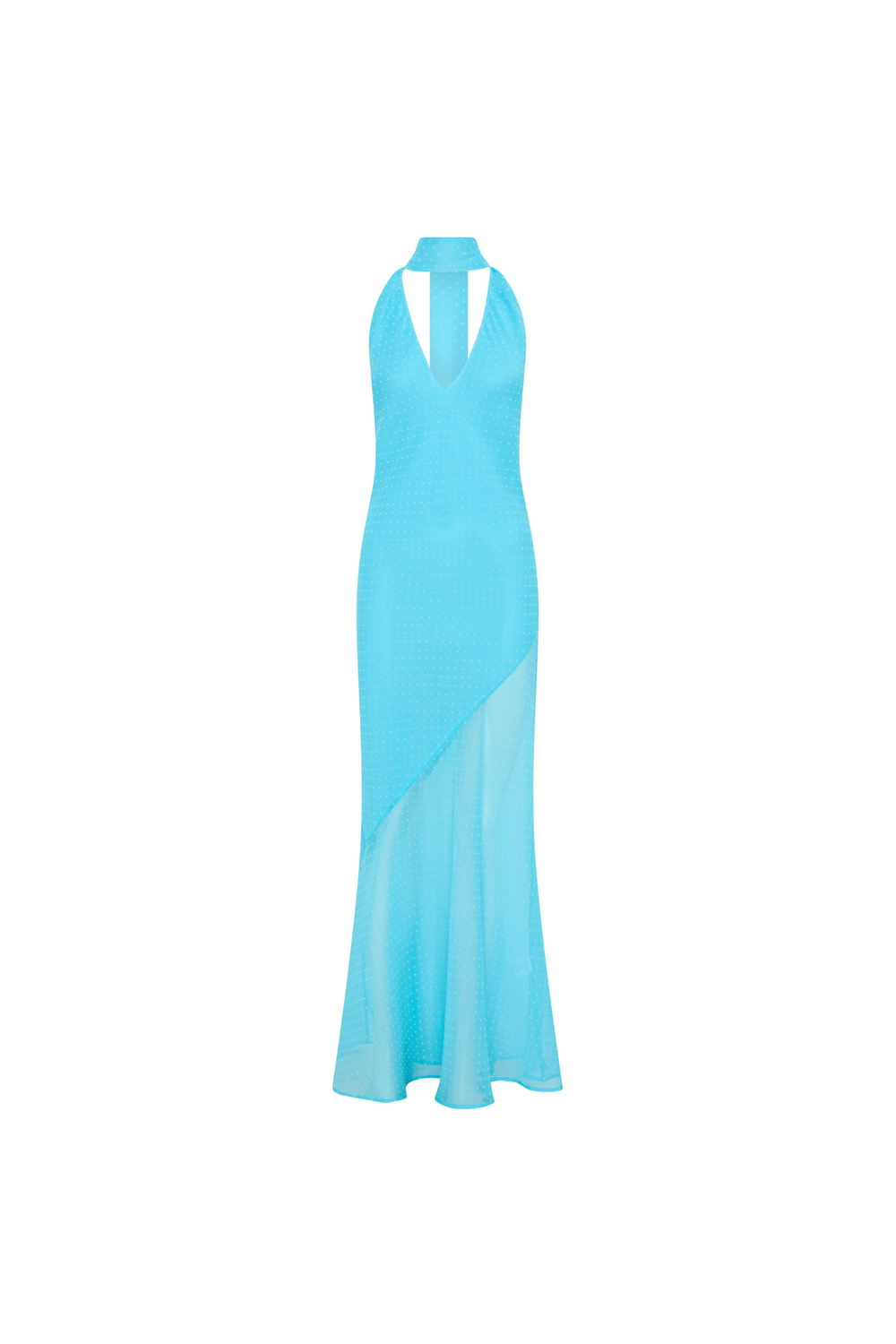 Breeze into every moment with the Thalia Maxi Dress, a romantic silhouette made from airy, blue polka-dot georgette. Featuring a plunging neckline and low open back, it’s finished with an elegant detachable neck tie and sheer flared hem for the ultimate floaty finish. Feminine, flattering, and unforgettable.
