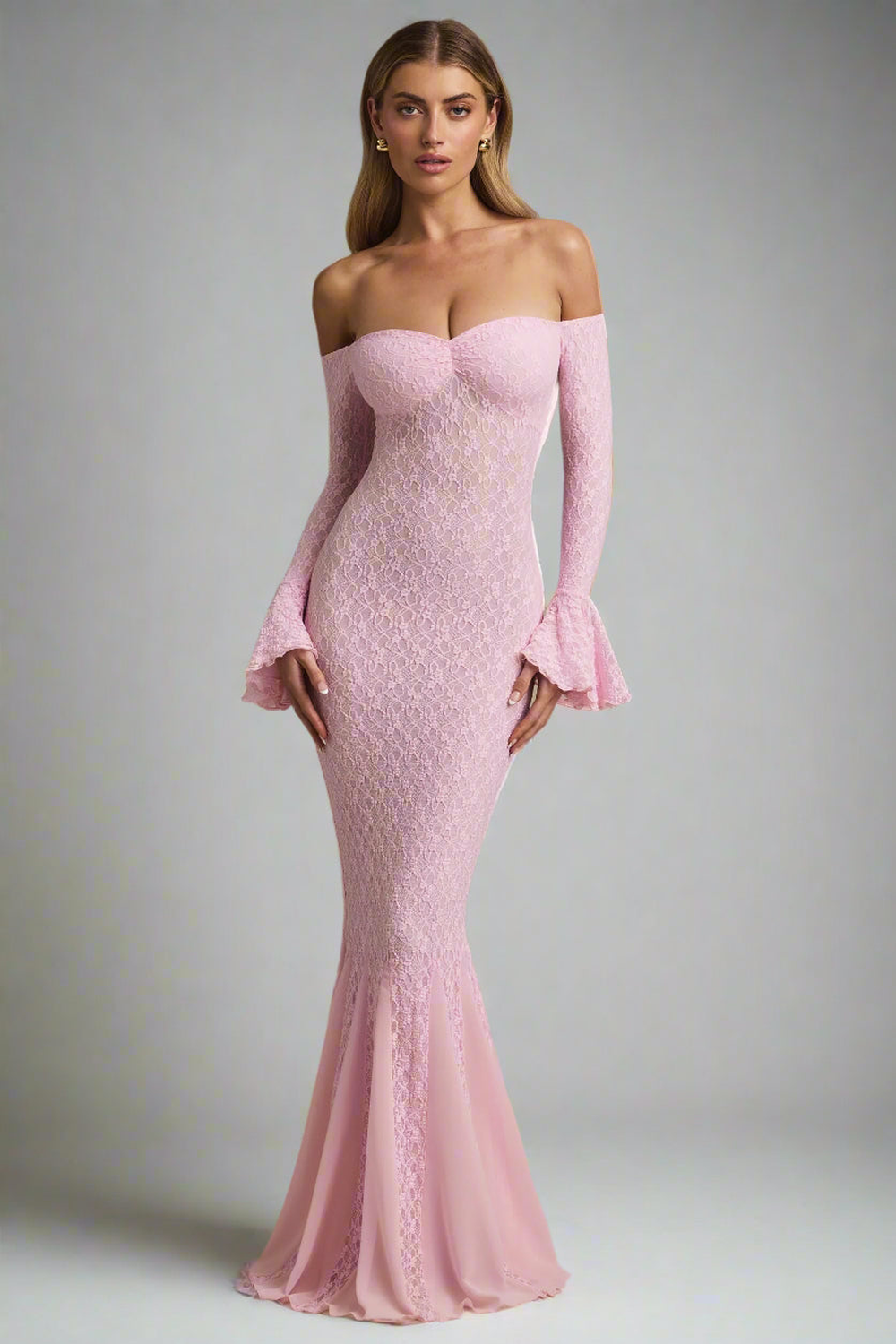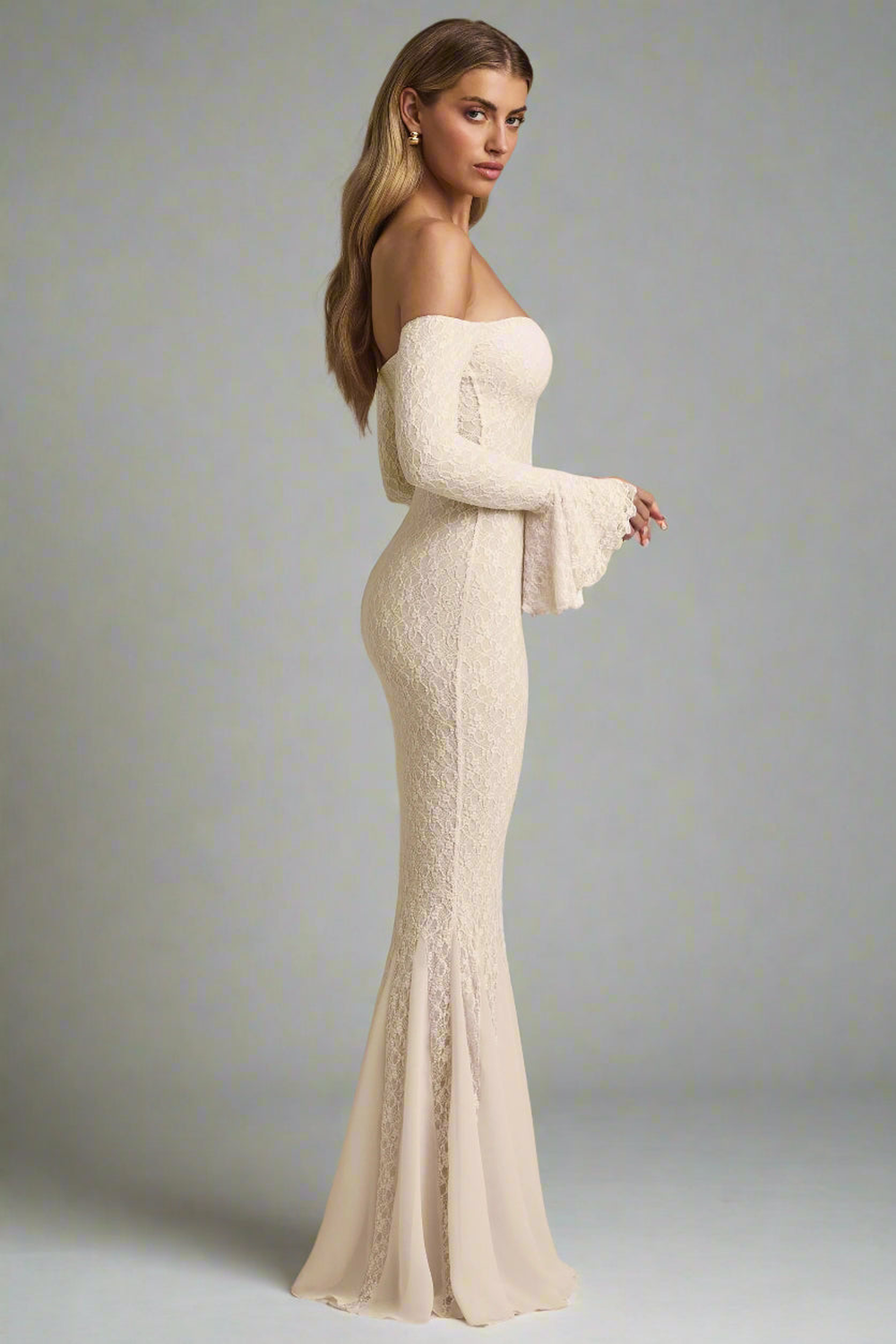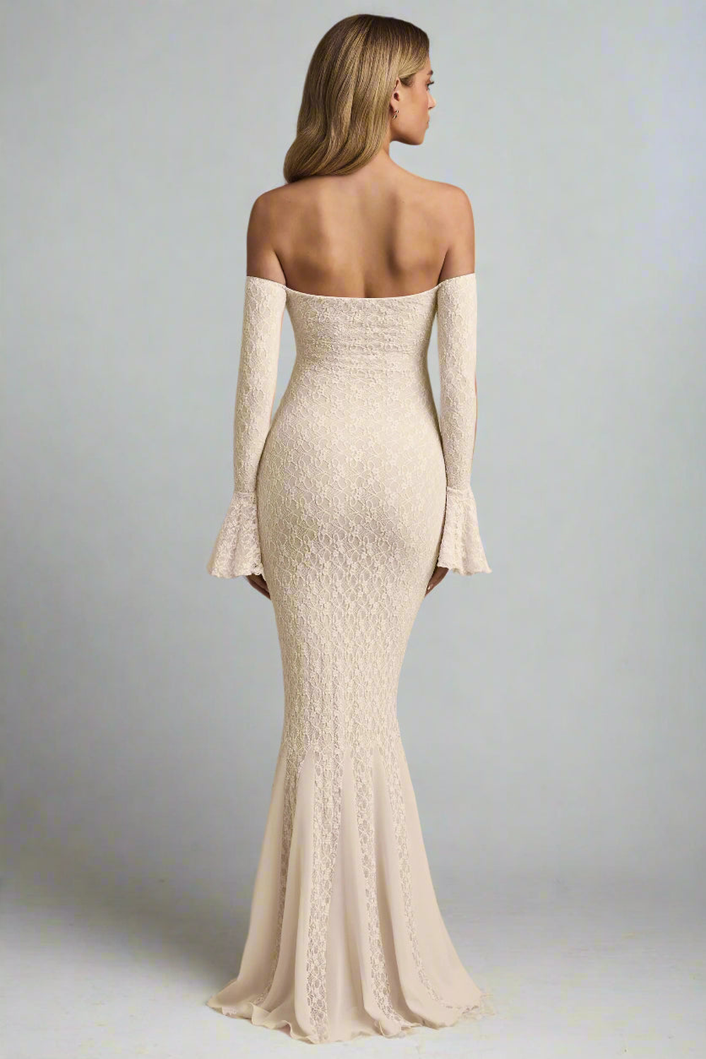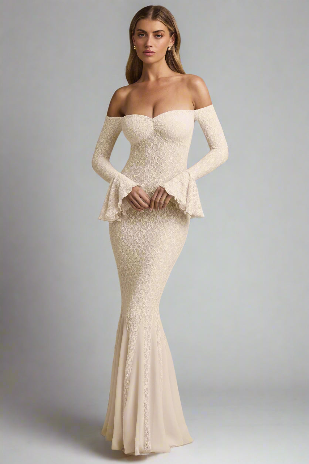 Romantic silhouettes, best served under the sun. The Verena Maxi Dress blends elegance with soft movement, crafted from premium stretch lace and a sheer jersey lining for ultimate comfort. Framed with an off-shoulder sweetheart neckline and flared ruffled cuffs, this figure-hugging piece flares into godet pleats for graceful motion with every step.